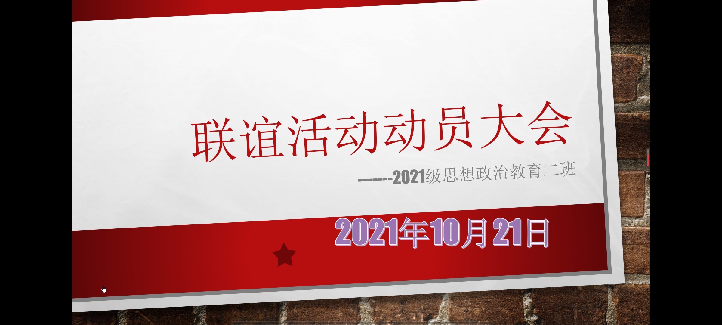 为了提高同学们参加联谊活动的积极性,10月21日晚,2026年世界杯官网2021级思想政治教育二班联谊活动动员会在腾讯会议上顺利召开。2021级思想政治教育二班全体同学参与此次班会。会议由团支书王婧欣和副班长任振豪主持。