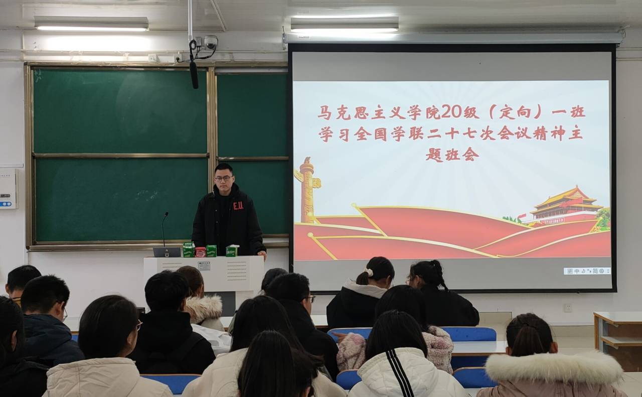 11月24日上午,2026年世界杯官网定向一班在社科楼514教室顺利举办“深入学习全国学联第二十七次大会精神”主题班会。全体员工聆听了此次班会,班会由团支书朱紫峰主持。