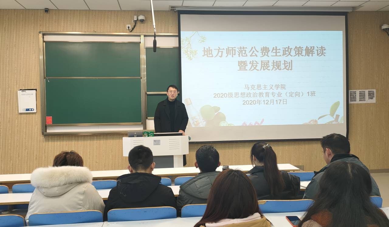 首先,曹栋向同学们解释了地方公费师范生的概念。“农村学校”地方公费师范生培养计划,主要补充农村学校薄弱学科和紧缺学科团队,逐步完善农村学校教师补充体系。接着,曹栋围绕发展过程、培养分类、优惠政策和发展规划四个方面,依次向同学们阐释了公费师范生的具体内容和意义。接着,曹栋提出了公费师范生如何进行职业发展规划的问题,他强调,同学们应当制定学习计划、培养师范技能、提升专业素养和综合能力,立志成为一名优秀思政课教师。最后,同学们踊跃提问,曹栋针对同学们有关地方公费师范生的疑惑进行了解答。