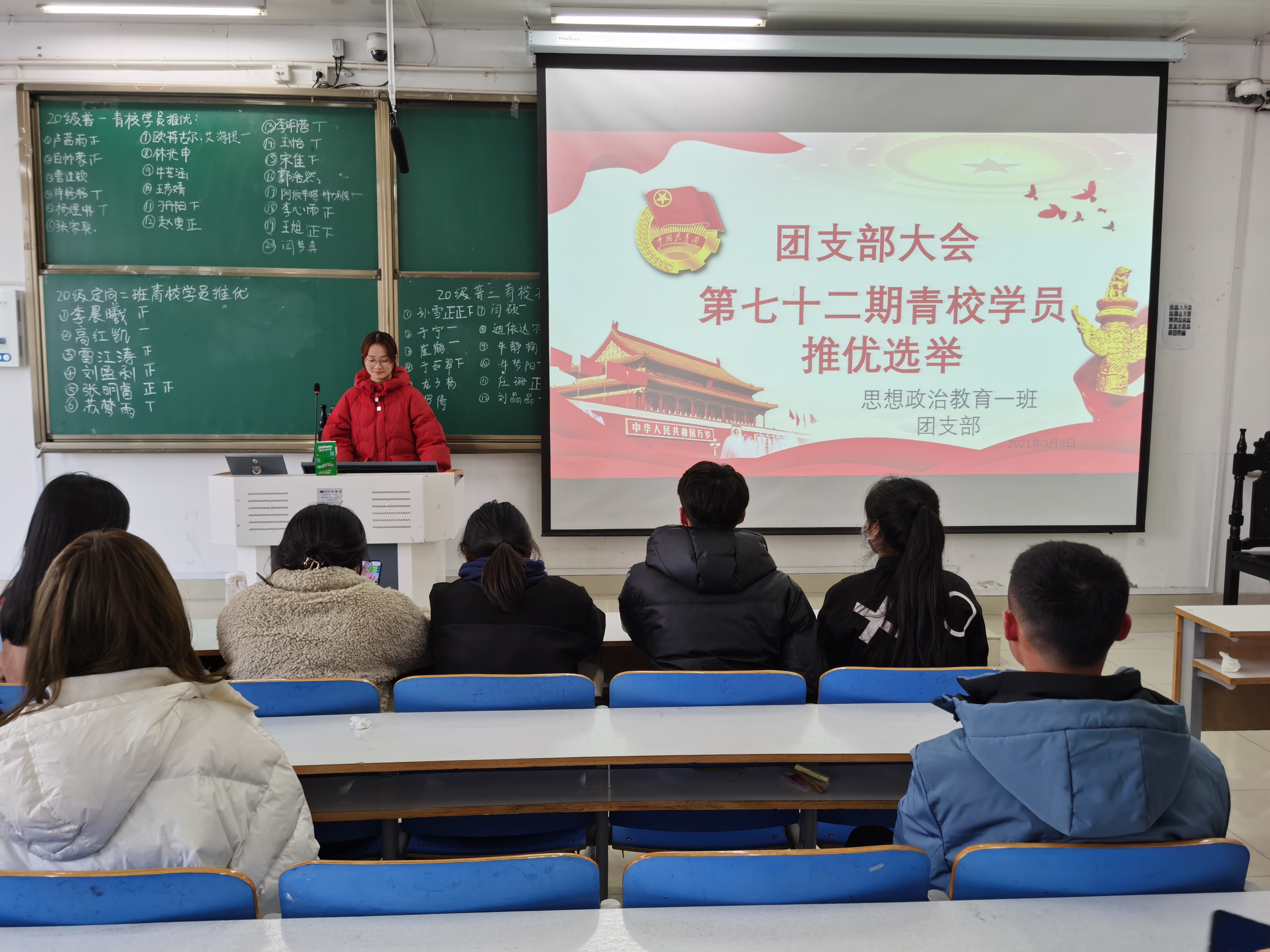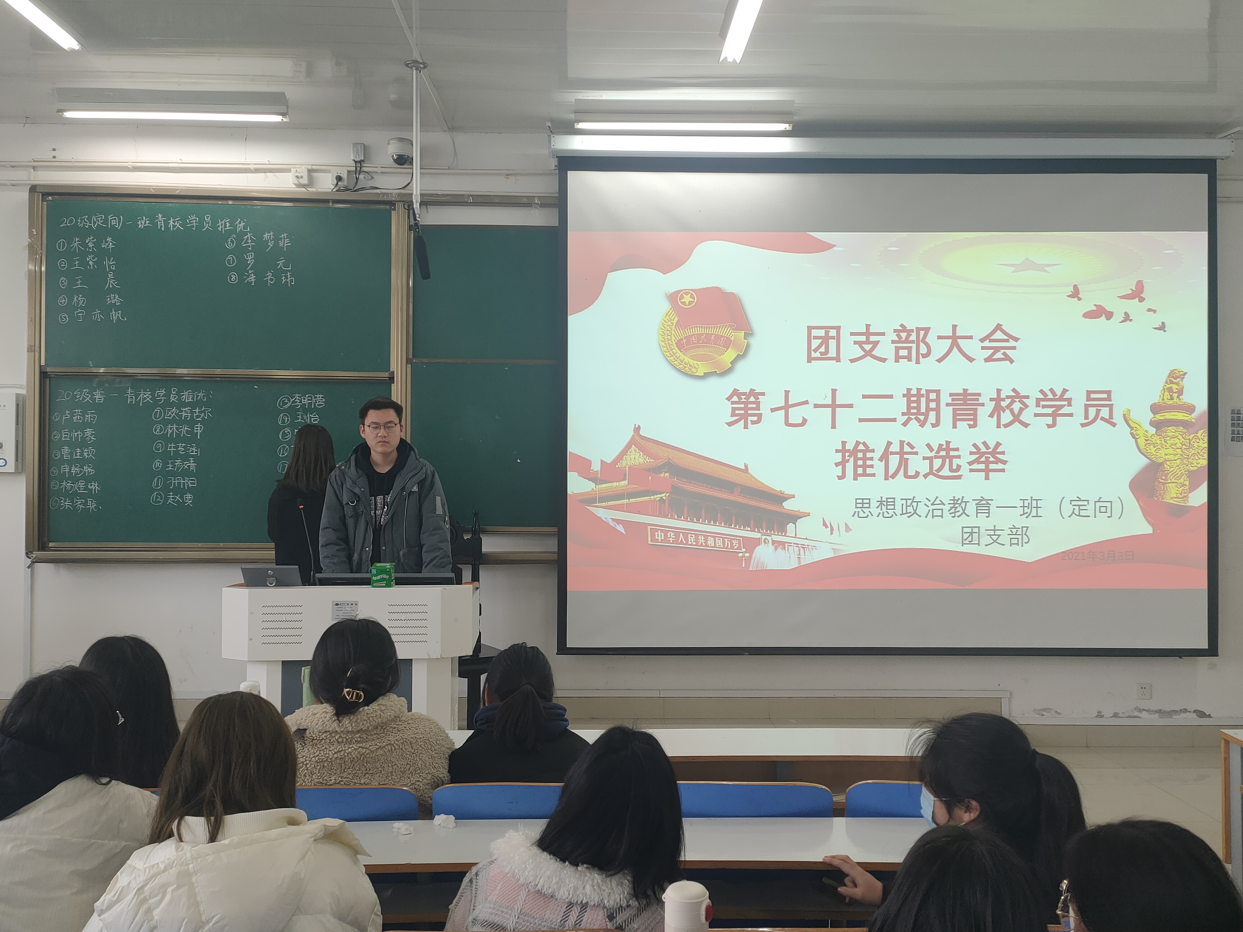 会议伊始,朱紫峰对上学期工作做出详细的汇报总结并简要阐述接下来的工作安排,他对支部委员们提出了三点建议:第一,在学习生活中用更高的标准规范自身行为,积极发挥模范带头作用,为同学们树立良好的榜样;第二,完成工作的同时应兼顾学习,切忌顾此失彼;第三,要及时反省自己的工作失误,吸取教训,提高工作效率和质量。接着,思想政治教育普通一班、(定向)一班全体员工通过不记名投票的方式选举出第七十二期优秀青校学员。最后,卢茜雨总结发言,她指出,班级工作的顺利开展离不开每位支部委员的共同努力,希望全体成员继续保持认真负责的态度,更好地为同学们服务。
