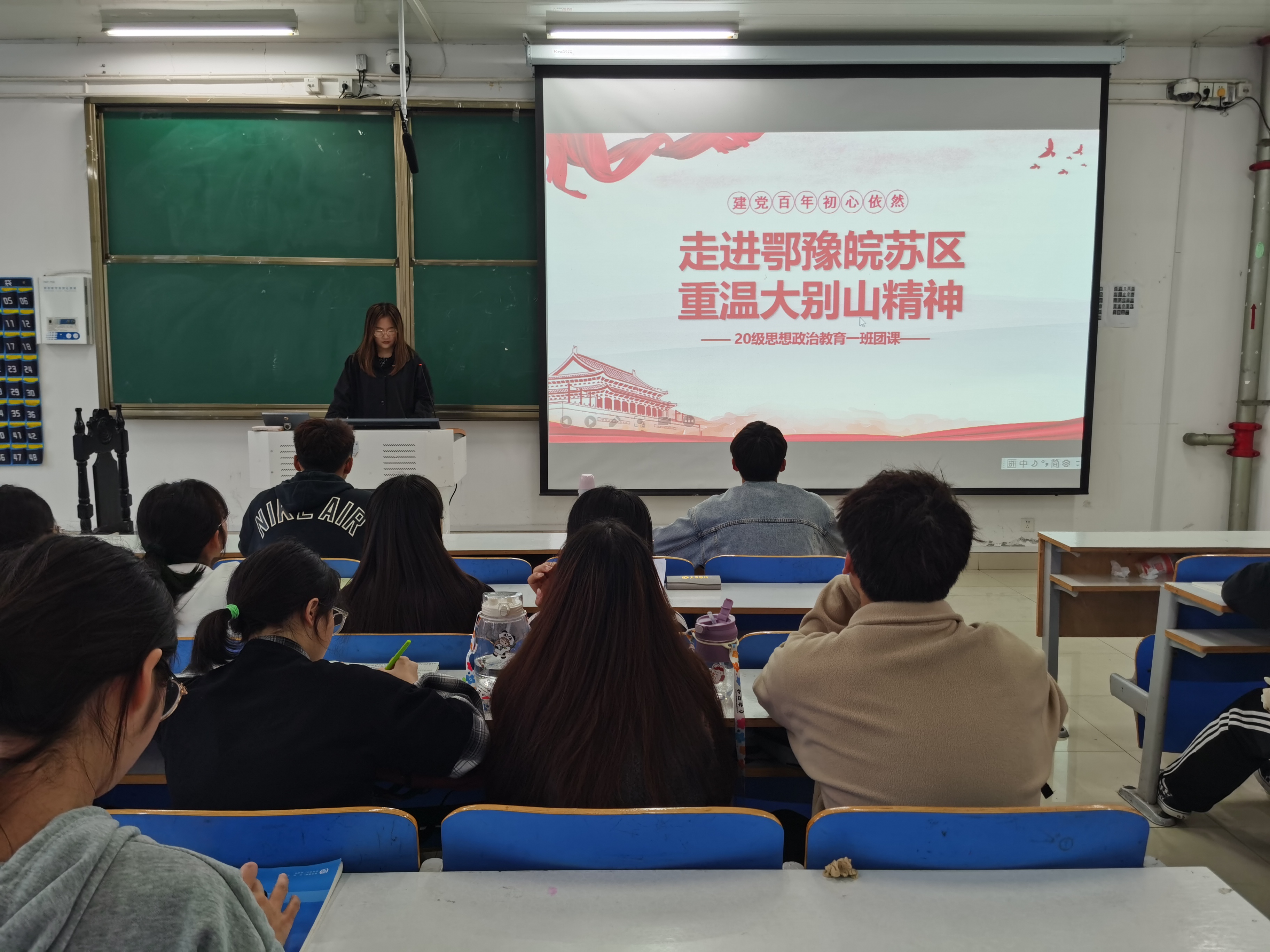 4月20日下午,2020级思想政治教育一班在社科楼516教室开展“走进鄂豫皖苏区,重温大别山精神 ”主题团课。2020级思想政治教育一班全体团员参加本次团课,本次团课由文体委员牛艺涵主持。