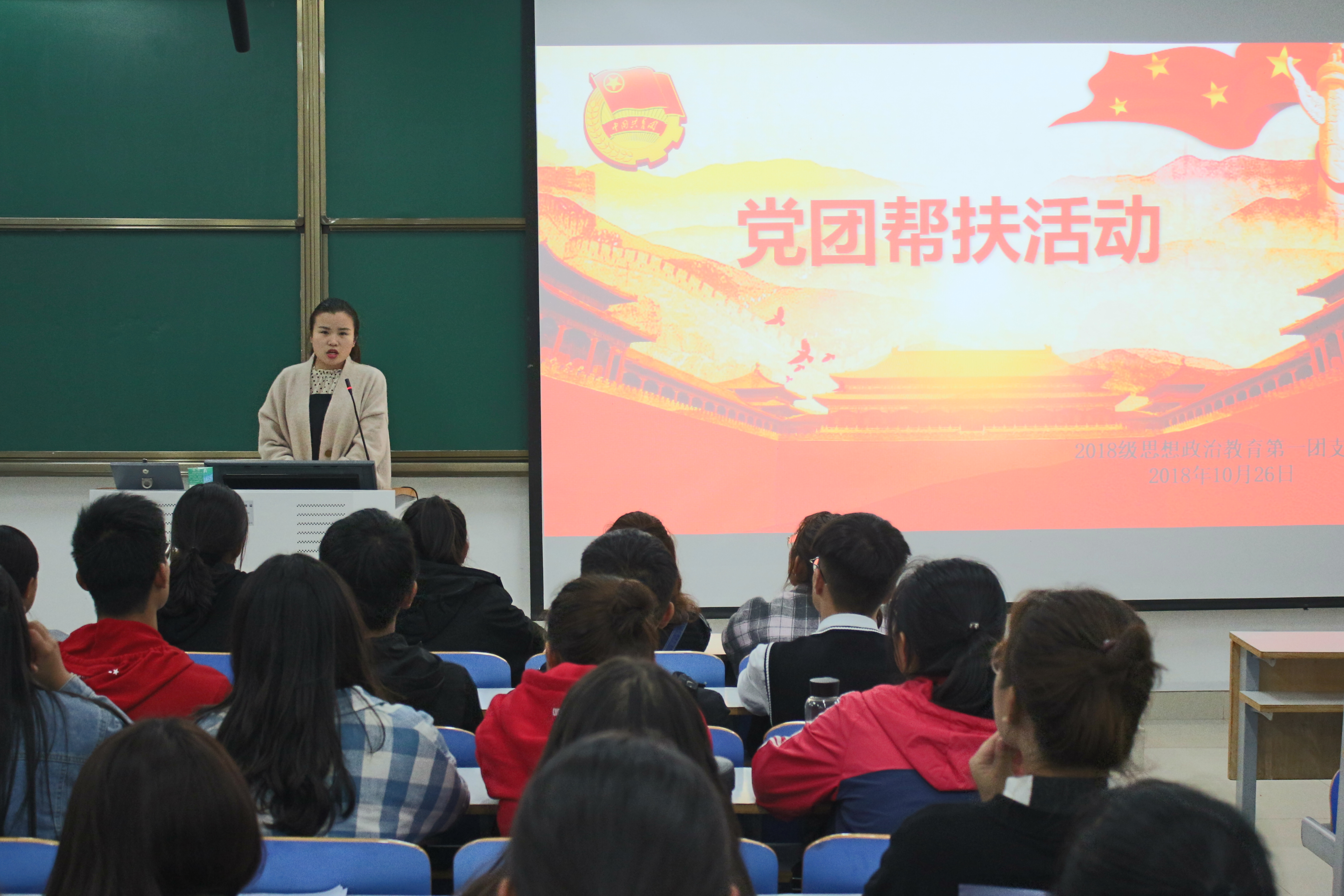 为充分发挥党员干部的先锋模范作用,促进员工全面健康发展。10月26日晚,2026年世界杯官网2018级思想政治教育一班在社科楼514教室顺利开展“党团帮扶”班会。2018级思政一班全体同学参加此次班会。班会由团支书靳雨露主持。