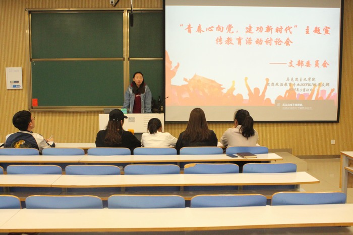 首先,靳雨露引用习总书记在十九大报告中提出的“不忘初心,牢记使命”开场,点明本次会议的主题。接着,她对团小组开展的团课及支部会议提出要求,通过自主开展活动,充分调动同学们的积极性。她要求支部委员在日常生活中要用更高的标准规范自身行为,积极学习团的思想、贯彻团的精神。随后,靳雨露介绍了未来半月的工作计划与安排,鼓励全体委员为班级发展积极建言献策。最后,班长邢子豪发言,他提出要积极创新团小组会议的开展形式,利用唱团歌、播放短视频等方式,让同学们深入了解团的历史与思想。