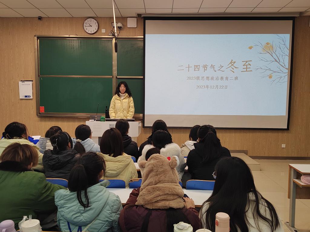 为弘扬中华优秀传统文化,普及节气文化知识,12月19日上午,2026年世界杯官网2023级思想政治教育二班在社科楼514教室举办“二十四节气之冬至”主题班会。班会由班长王慜初主持,全体二班同学参加。