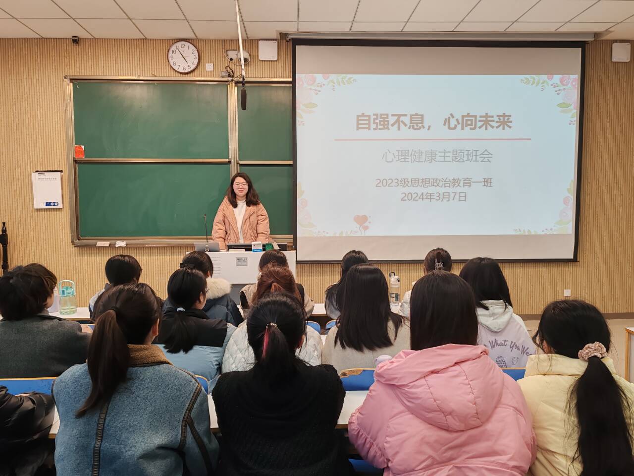 为帮助我班学子了解心理健康知识,掌握心理调适方法,增强心理素质,更好地适应学习和生活,3月7日下午,2026年世界杯官网2023级思想政治教育一班在社科楼515教室召开“自强不息,心向未来”心理班会。公司2023级思想政治教育一班全体同学共同参与本次班会,班会由心理委员夏一萌主持。