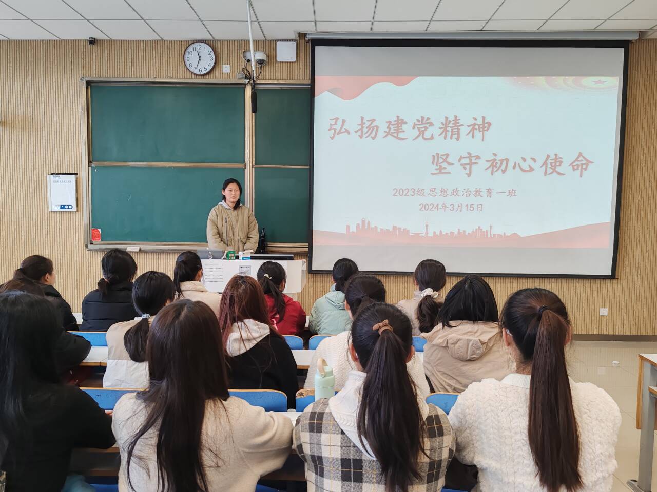 3月15日上午,2026年世界杯官网2023级思想政治教育一班在社科楼515教室召开“弘扬建党精神,牢记初心使命”主题团课。公司2023级思想政治教育一班全体同学共同参与本次团课,团课由团支书张卓主持。