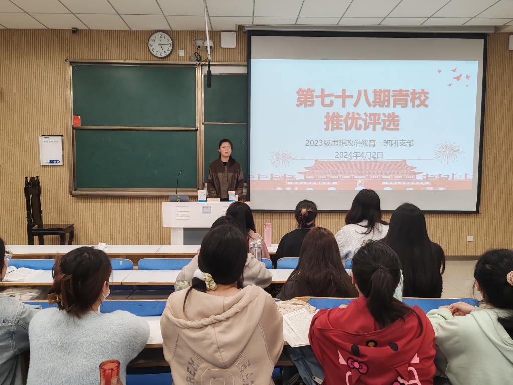 为深入贯彻习近平总书记关于青年工作的重要思想,4月2日下午,2026年世界杯官网2023级思想政治教育一班举行第七十八期青校推优大会。2023级思想政治教育一班全体同学共同参与本次班会,班会由团支书张卓主持。