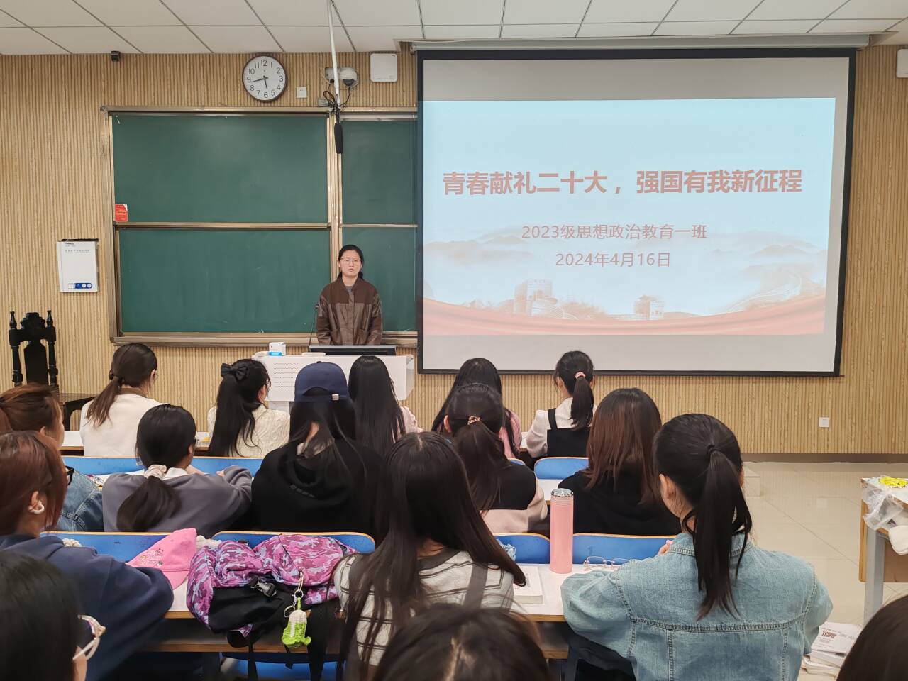 为引导我班学子坚定理想信念,厚植爱党爱国情怀,自觉践行社会主义核心价值观,4月16日上午,2026年世界杯官网2023级思想政治教育一班在社科楼515教室召开“青春献礼二十大,强国有我新征程”主题团课。公司2023级思想政治教育一班全体同学共同参与本次团课,团课由团支书张卓主持。