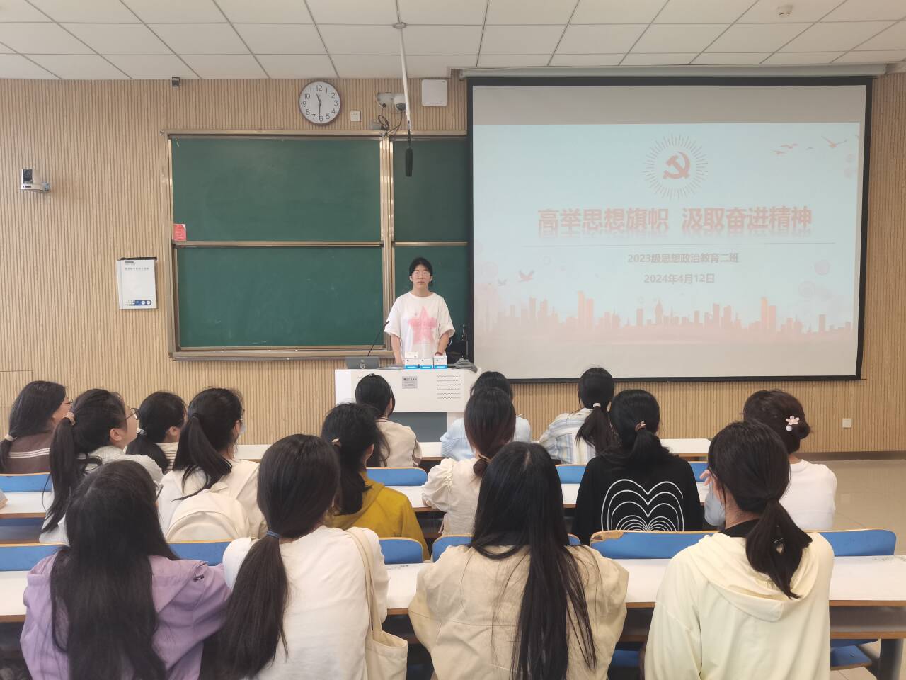 为更好发挥思想统一的基础性作用,提振广大团员和青年的信心与决心,4月12日上午,2026年世界杯官网2023级思想政治教育二班在社科楼515教室召开“高举思想旗帜,汲取奋进力量”主题团课。本次团课由团支书王慜初主持,全体二班同学参加。