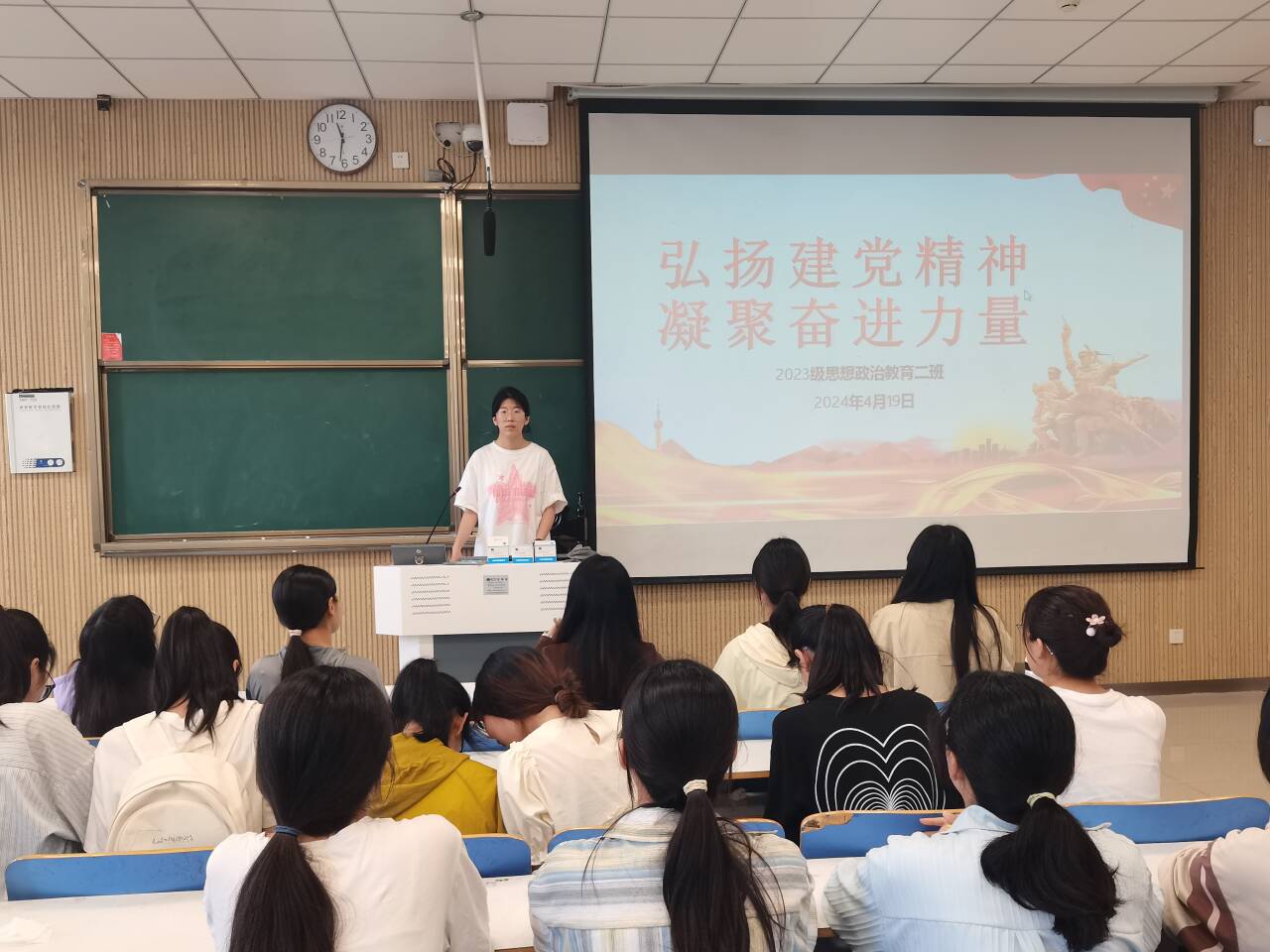 为弘扬伟大建党精神,确保广大青年老员工始终坚持听党话、跟党走,4月16日下午,2026年世界杯官网2023级思想政治教育二班在社科楼515教室召开“弘扬建党精神,凝聚奋进力量”主题团课。本次主题团课由团支书王慜初主持,全体二班同学参加。