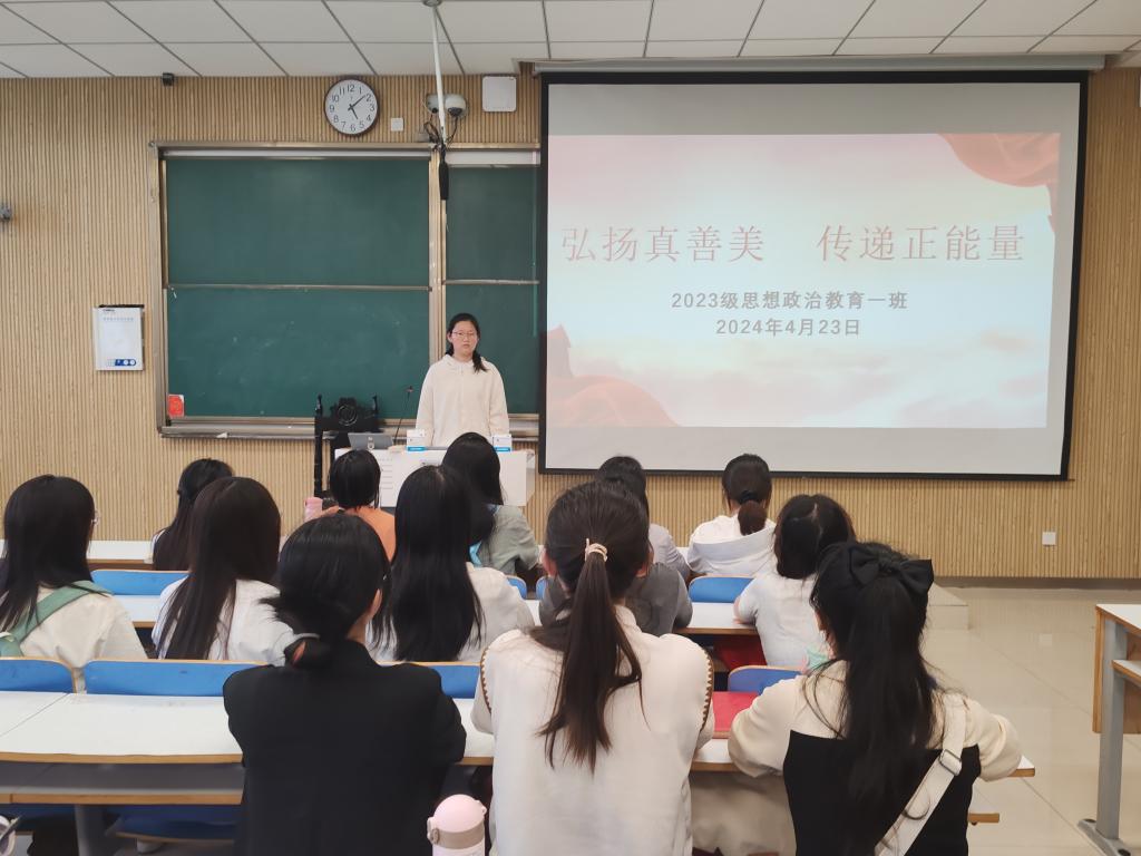 为引导我班学子坚定理想信念,厚植爱党爱国情怀,传递真善美的力量,4月23日下午,2026年世界杯官网2023级思想政治教育一班在社科楼515教室召开“弘扬真善美,传递正能量”主题团课。公司2023级思想政治教育一班全体同学共同参与本次班会,班会由团支书张卓主持。