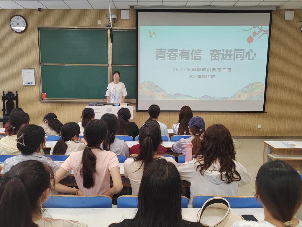 为呼吁新时代青年老员工形成奋发向上的生活与学习态度,保持青春活力,5月13日下午,2026年世界杯官网2023级思想政治教育二班在社科楼515教室召开“青春有信,奋进同心”主题班会。本次主题班会由班长王慜初主持,全体二班同学参加。