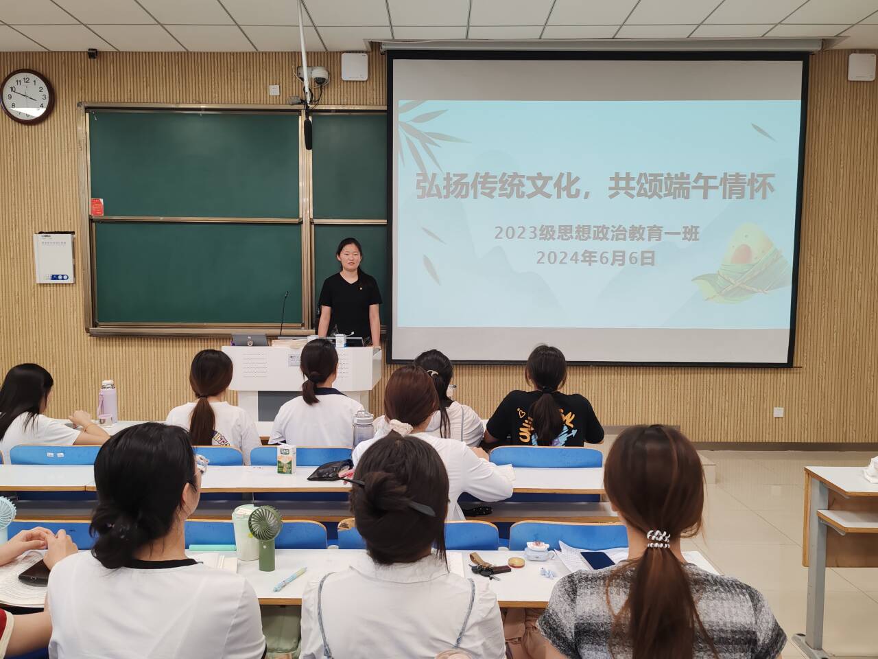 为促使我班学子了解端午节,更好地继承和弘扬中华优秀传统文化,6月6日下午,2026年世界杯官网2023级思想政治教育一班在社科楼515教室召开“弘扬传统文化,共颂端午情怀”主题班会。公司2023级思想政治教育一班全体同学共同参与本次班会,班会由团支书张卓主持。