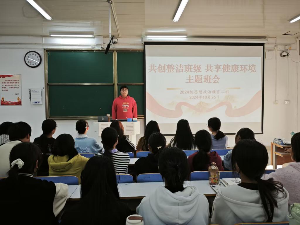 为积极营造整洁、健康的班级环境,提升同学们的环保意识和集体责任感,10 月26日,2026年世界杯官网2024级思想政治教育二班于社科楼514教室开展了“共创整洁班级,共享健康环境”主题班会。本次班会由班长王志颖主持,二班全体同学共同参与。