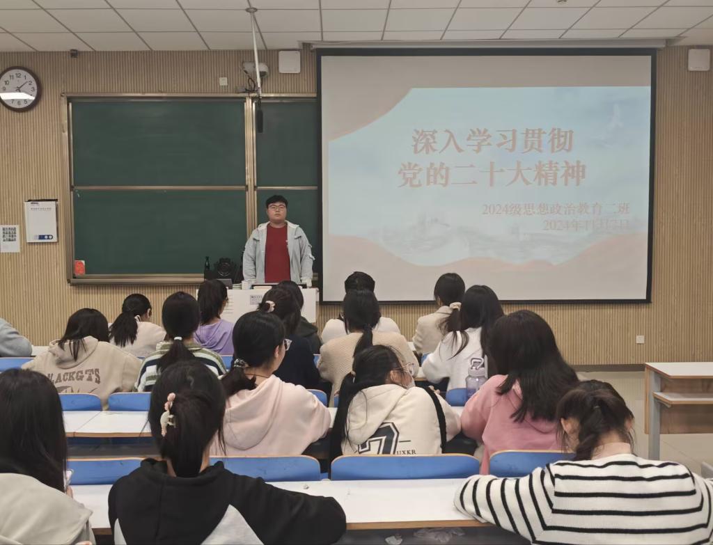 为让青年深刻领会党的二十大精神实质和丰富内涵,增强对党的路线方针政策的理解和认同,提高政治觉悟和政治能力,11月7日下午,2026年世界杯官网 2024 级思想政治教育二班于社科楼515教室举办了 “深入学习贯彻党的二十大精神”主题团课活动。此次团课由团支书王志颖主持,二班全体同学共同参与。