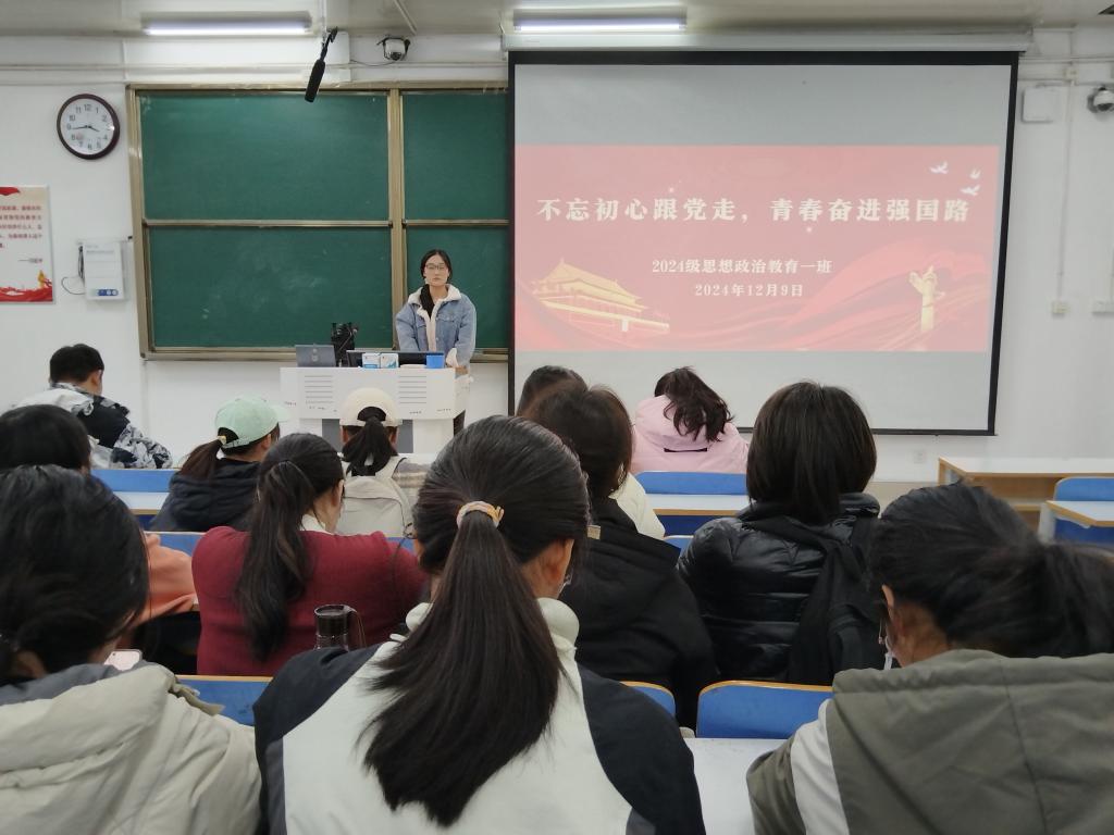 为引导我班员工深入学习党的历史,增强党性修养,积极投身国家建设,12月9日上午,2024级思想政治教育一班于社科楼515教室开展“不忘初心跟党走,青春奋进强国路”主题团课。本次团课由团支书李冉主持,一班全体同学参加。