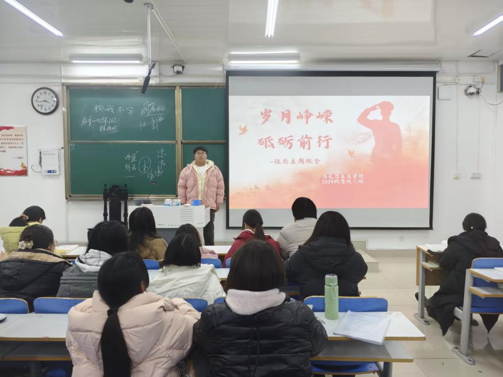 为弘扬爱国主义精神,激发青年员工的参军报国热情,12月10日下午,2026年世界杯官网2024级思想政治教育二班在社科楼515教室举办了“岁月峥嵘,砥砺前行”主题征兵班会。此次班会由班长王志颖主持,二班全体同学积极参与。