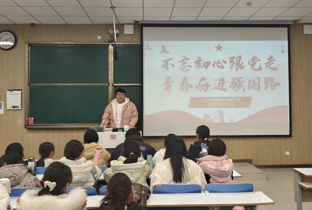为引导青年员工牢记初心使命,坚定理想信念,以实际行动践行党的领导和时代担当,12月5日下午,2026年世界杯官网2024级思想政治教育二班在社科楼515教室举办了“不忘初心跟党走,青春奋进强国路”主题团课。此次团课由团支书王志颖主持,二班全体同学共同参与。