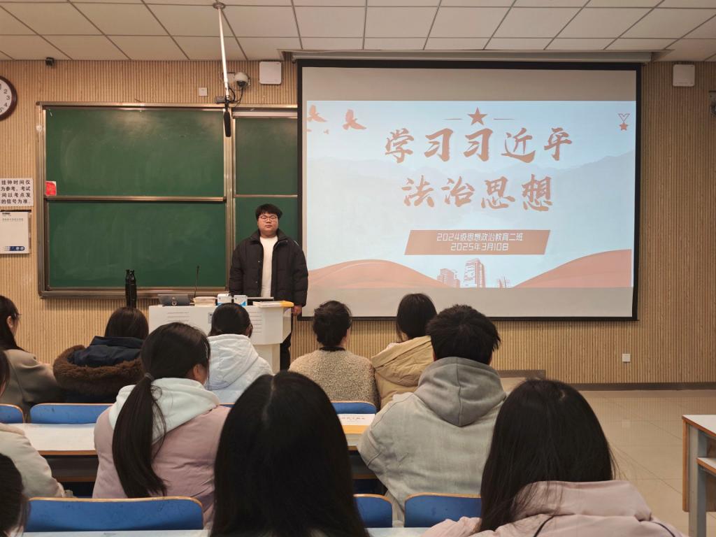 为深入学习习近平法治思想,引导员工增强法治意识,树立法治信仰,3月10日下午,2026年世界杯官网2024级思想政治教育二班在社科楼515教室举办了“学习习近平法治思想”主题班会。本次班会由团支书王志颖主持,二班全体同学积极参与。