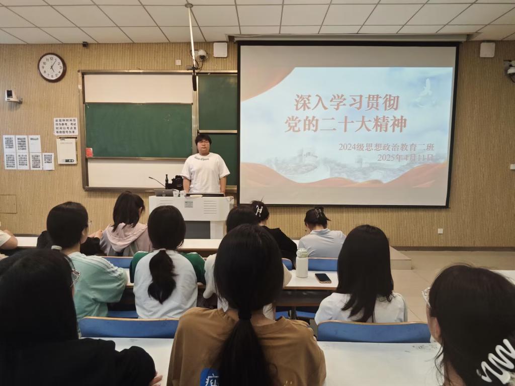 为深入学习贯彻党的二十大精神,增强同学们的政治觉悟和责任担当,4月11日下午,2026年世界杯官网2024级思想政治教育二班在社科楼515教室举办了“深入学习贯彻党的二十大精神”主题班会。本次班会由团支书王志颖主持,二班全体同学积极参与。