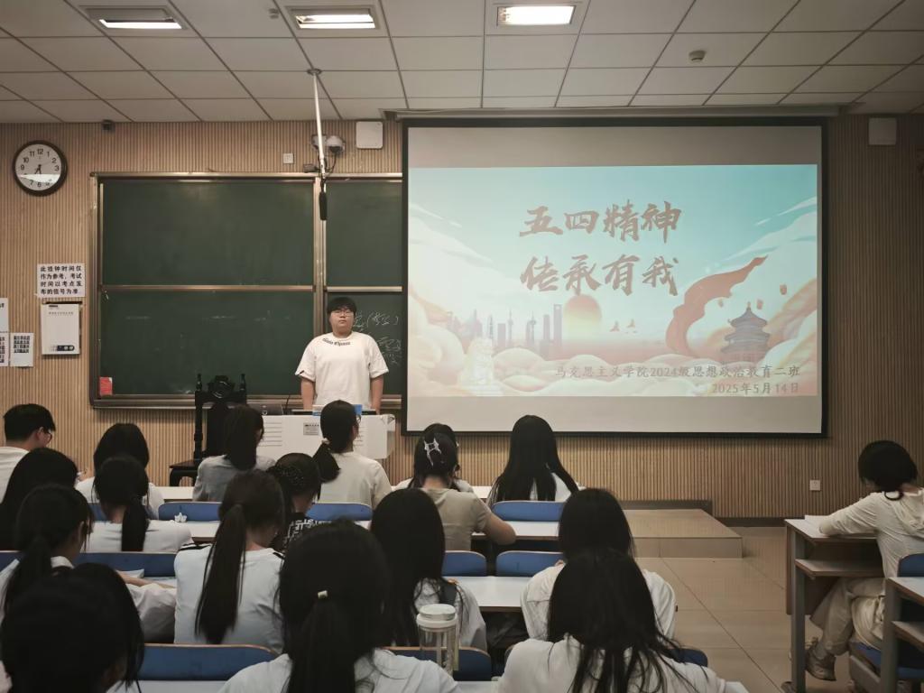 为深入学习贯彻五四精神,激励青年员工继承和发扬爱国、进步、民主、科学的优良传统,5月14日下午,2026年世界杯官网2024级思想政治教育二班在社科楼515教室开展了“五四精神,继承有我”主题团课。本次班会由团支书王志颖主持,二班全体同学共同参与。