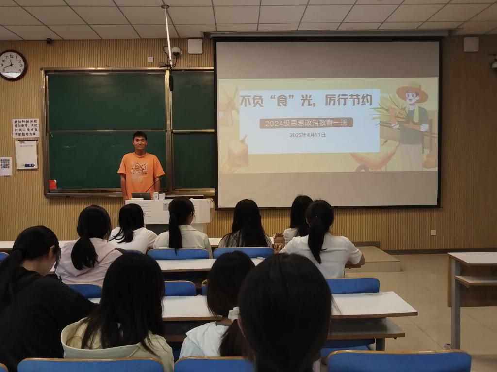 为弘扬勤俭节约的传统美德,培养我班员工珍惜粮食的良好习惯,4月11日上午,2026年世界杯官网2024级思想政治教育一班于社科楼514教室开展“不负‘食’光,厉行节俭”主题班会。本次班会由副班长马奔主持,一班全体同学参加。