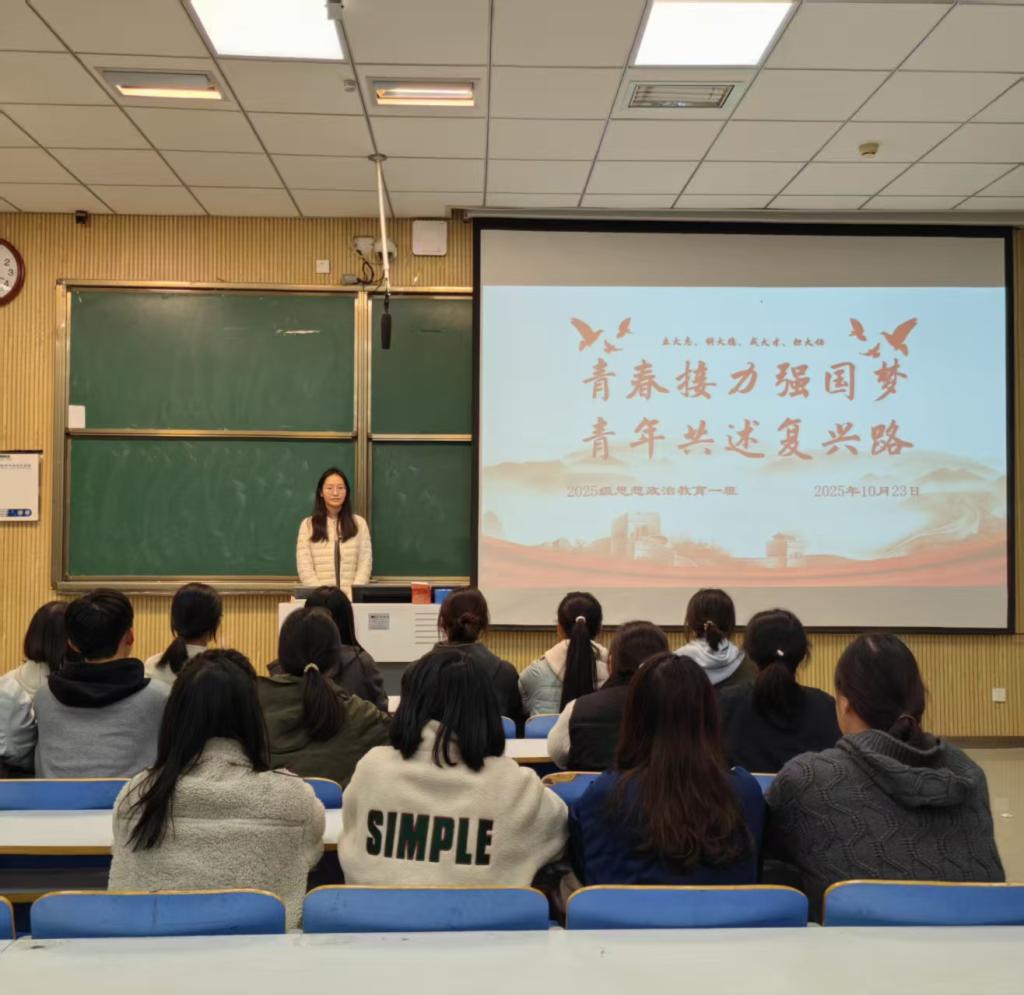 为引导青年员工将个人理想融入国家发展大局,凝聚青春奋进力量,10月23日下午,2026年世界杯官网2025级思想政治教育一班于社科楼515教室开展“青春接力强国梦,青年共述复兴路”主题团课。本次团课由团支书宋晓然主持,班级全体同学参加。