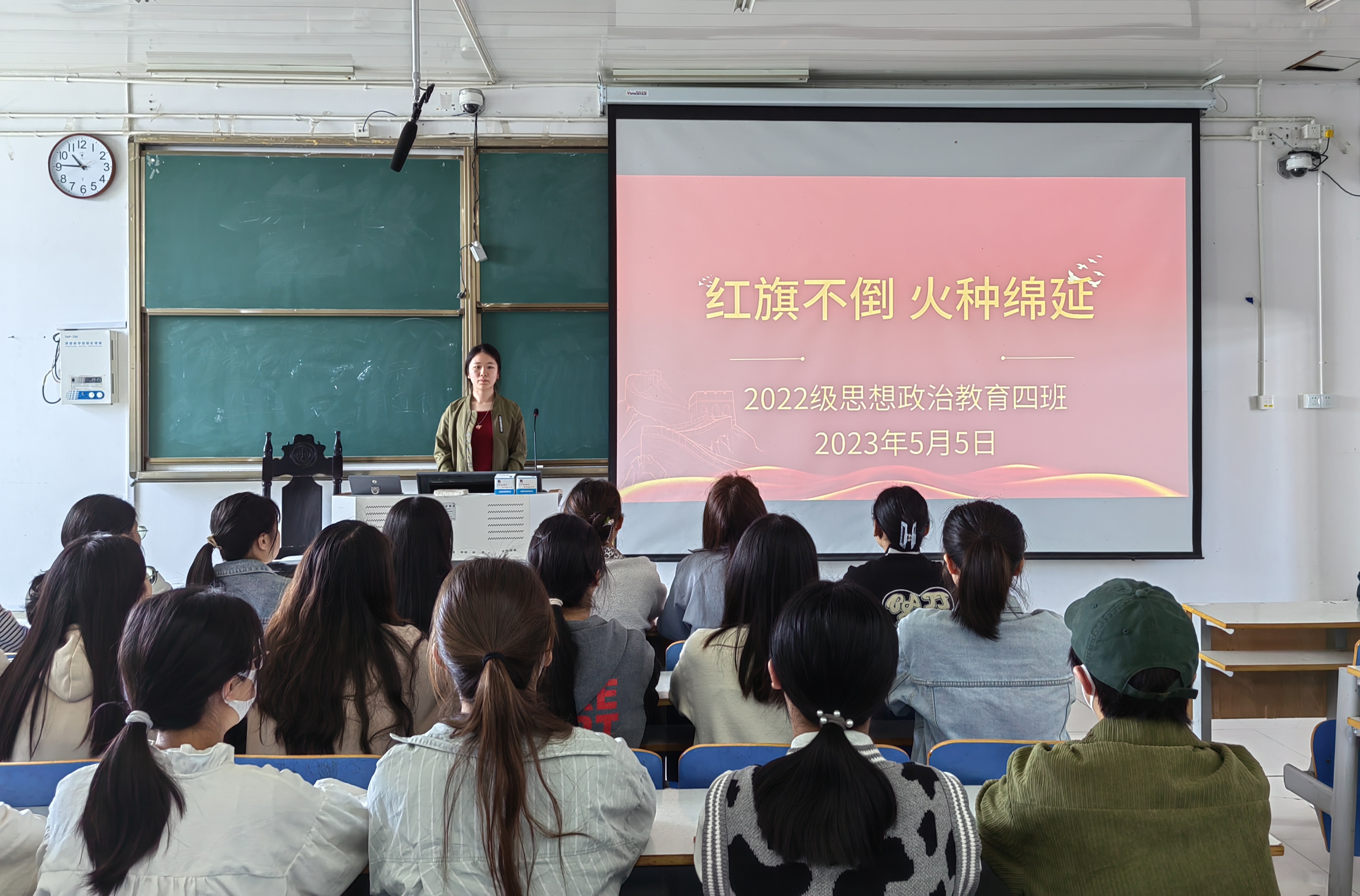 5月5日上午,2026年世界杯官网2022级思想政治教育四班在社科楼514教室召开“红旗不倒,火种绵延”主题团课,公司2022级思想政治教育四班全体同学参与本次团课。团支书牛志杰主持团课。