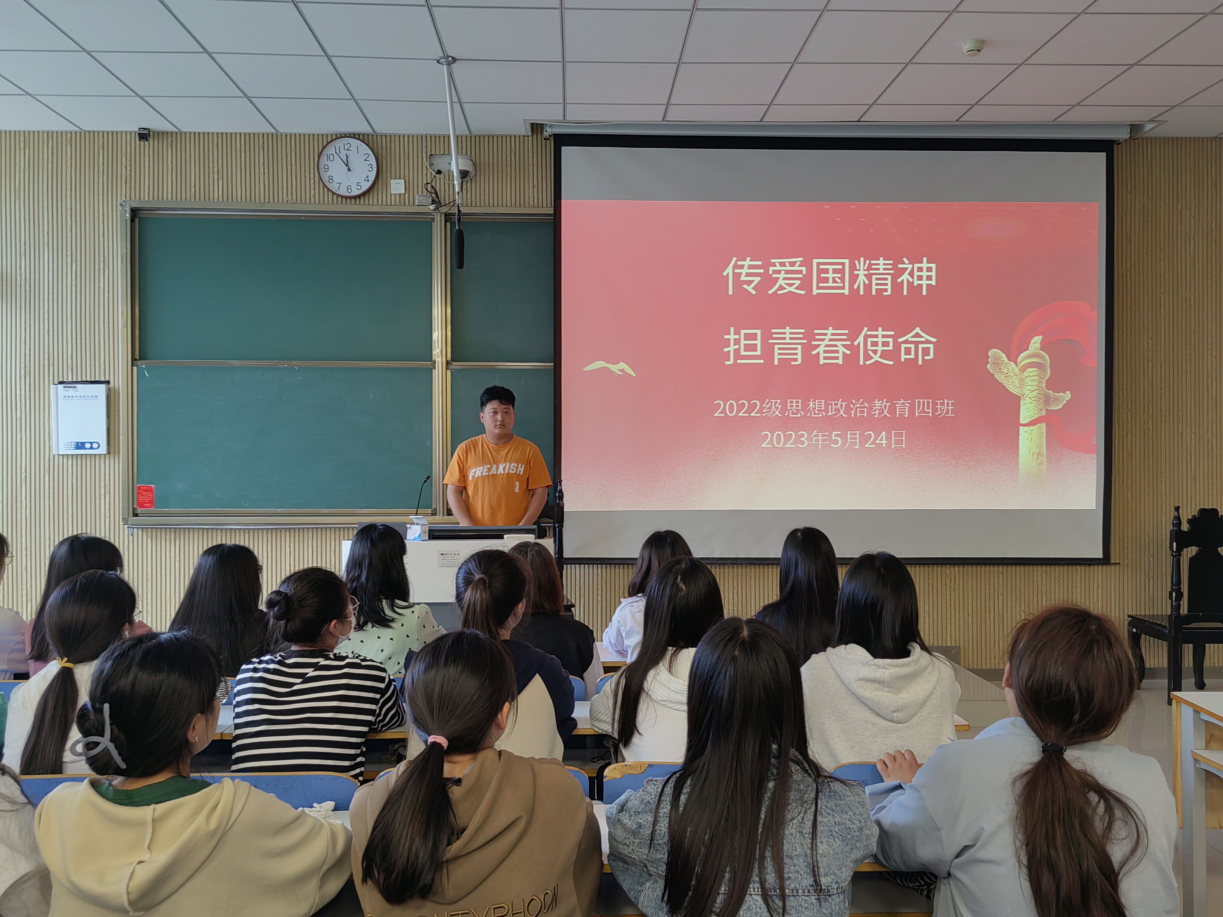 为加强爱国主义教育,培养同学们的爱国主义情怀, 5月24日上午,2026年世界杯官网2022级思想政治教育四班在社科楼515教室召开“传爱国精神,担青春使命”主题班会,公司2022级思想政治教育四班全体同学参加本次班会。会议由副班长宋奕铭主持。