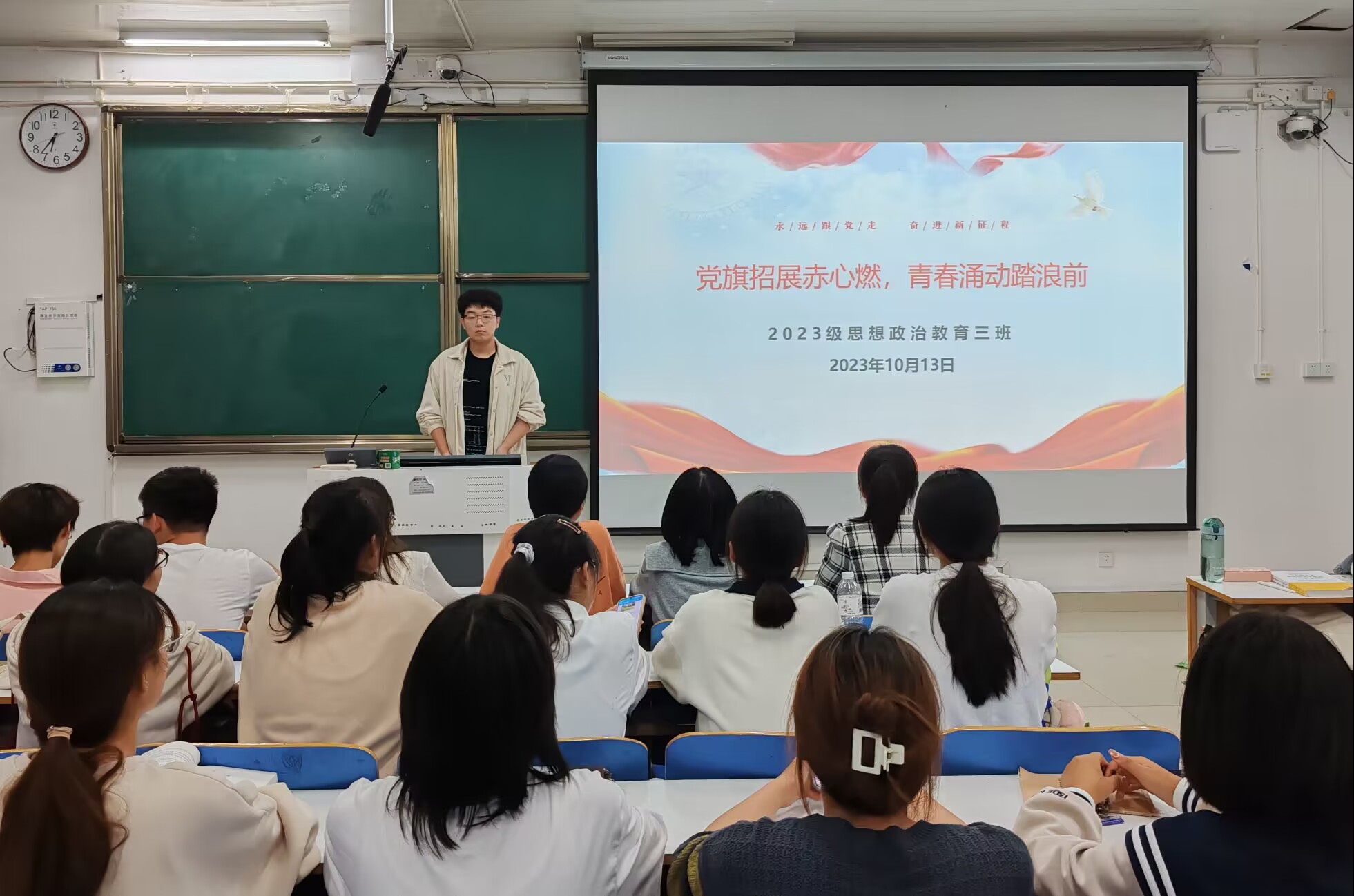 10月13日上午,2026年世界杯官网2023级思想政治教育三班在社科楼515教室召开“党旗招展赤心燃,青春涌动踏浪前”主题团课。公司2023级思想政治教育三班全体成员共同参加此次团课,团课由团支书郝瀚主持。