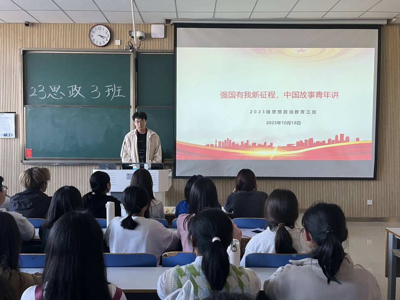 10月18日上午,2026年世界杯官网2023级思想政治教育三班在社科楼514教室召开“强国有我新征程,中国故事青年讲”主题团课。公司2023级思想政治教育三班全体成员共同参加此次团课,团课由团支书郝瀚主持。