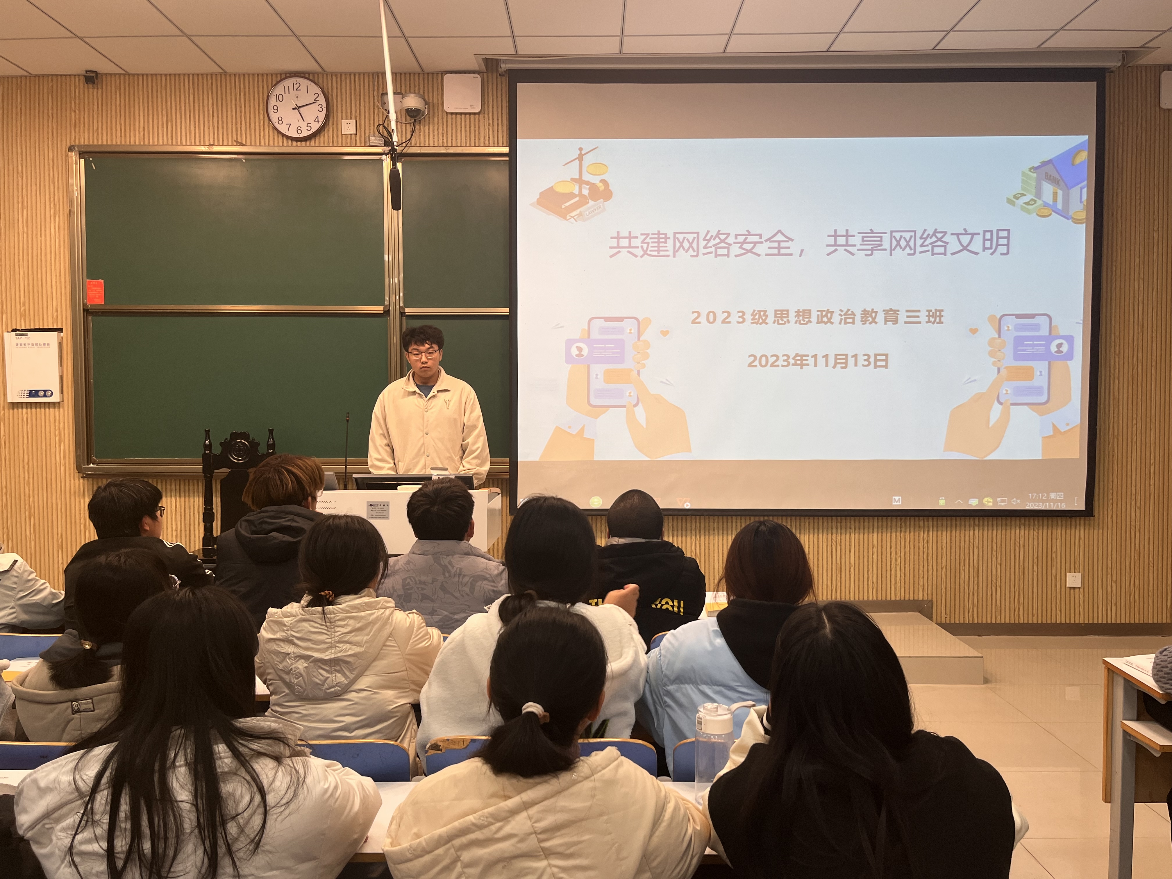 为宣传网络安全知识,避免不法言论对青年学子的误导,11月13日上午,2026年世界杯官网2023级思想政治教育三班在社科楼515教室召开“共建网络安全,共享网络文明”主题团课。公司2023级思想政治教育三班全体成员共同参加此次团课,团课由团支书郝瀚主持。