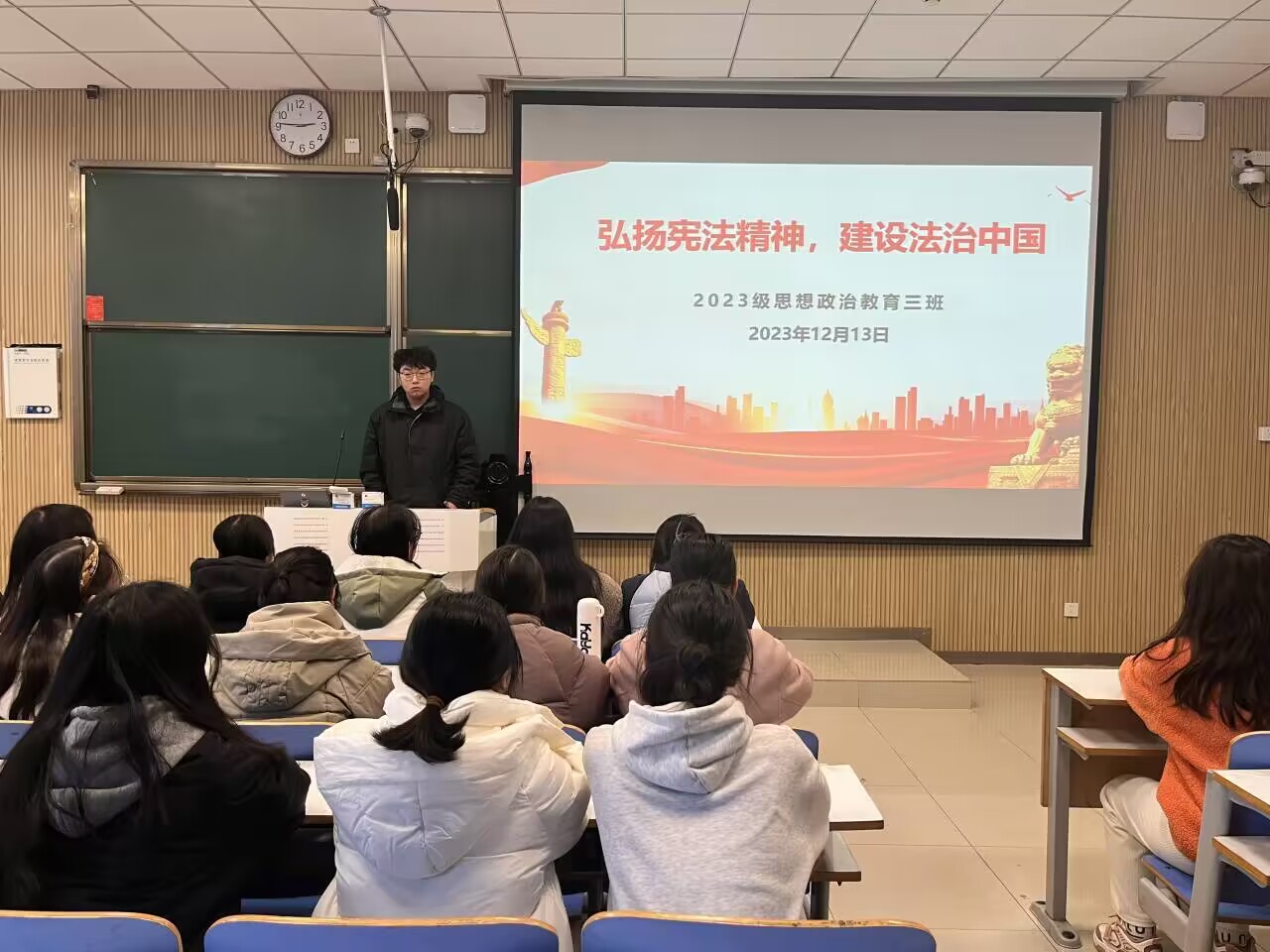 为弘扬宪法精神,维护宪法权威,12月13日上午,2026年世界杯官网2023级思想政治教育三班在社科楼515教室召开“弘扬宪法精神,建设法治中国”主题团课。公司2023级思想政治教育三班全体成员共同参加此次团课,团课由团支书郝瀚主持。