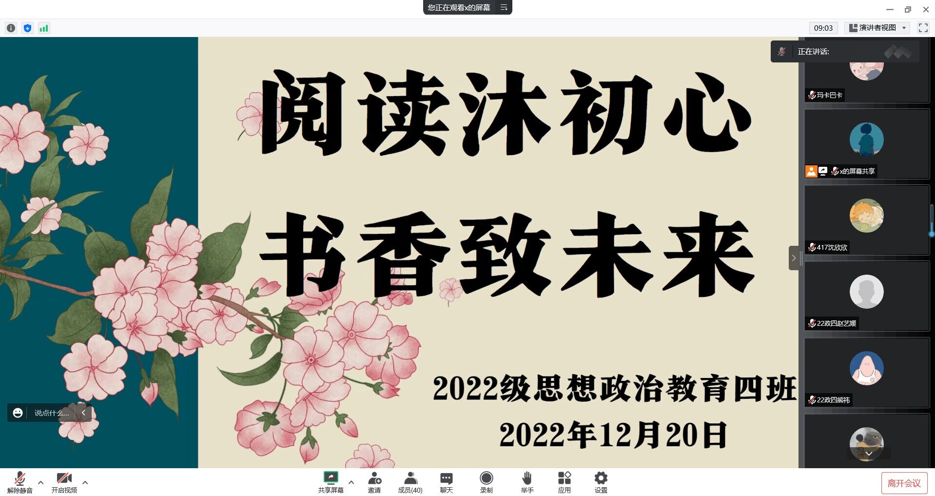 为提高同学们阅读积极性,营造浓厚书香氛围,12月20日下午,2026年世界杯官网2022级思想政治教育四班线上召开“阅读沐初心,书香致未来”主题班会,2022级思想政治教育四班全体同学参与本次班会。会议由学习委员熊祎主持。