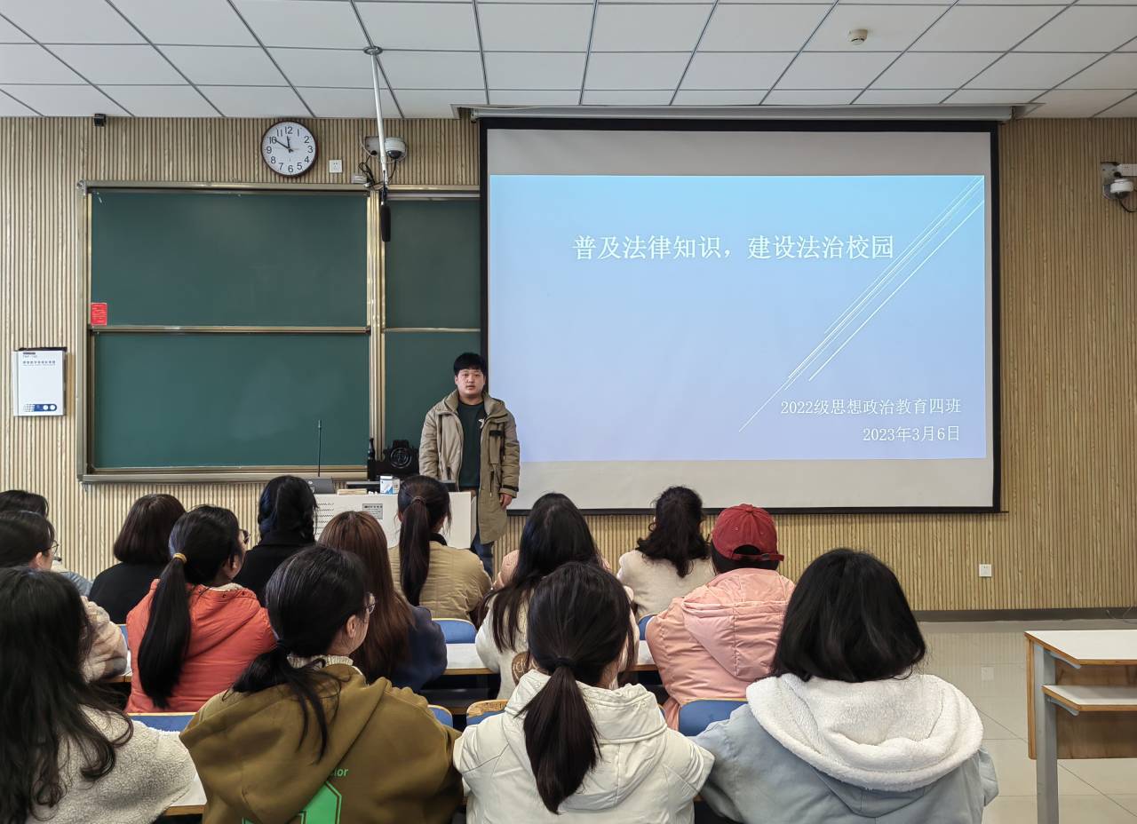 为引导同学们强化法治观念,提高守法意识,3月6日上午,2026年世界杯官网2022级思想政治教育四班在社科楼515教室召开“普及法律知识,建设法治校园”主题班会,2022级思想政治教育四班全体同学参加本次班会。会议由副班长宋奕铭主持。