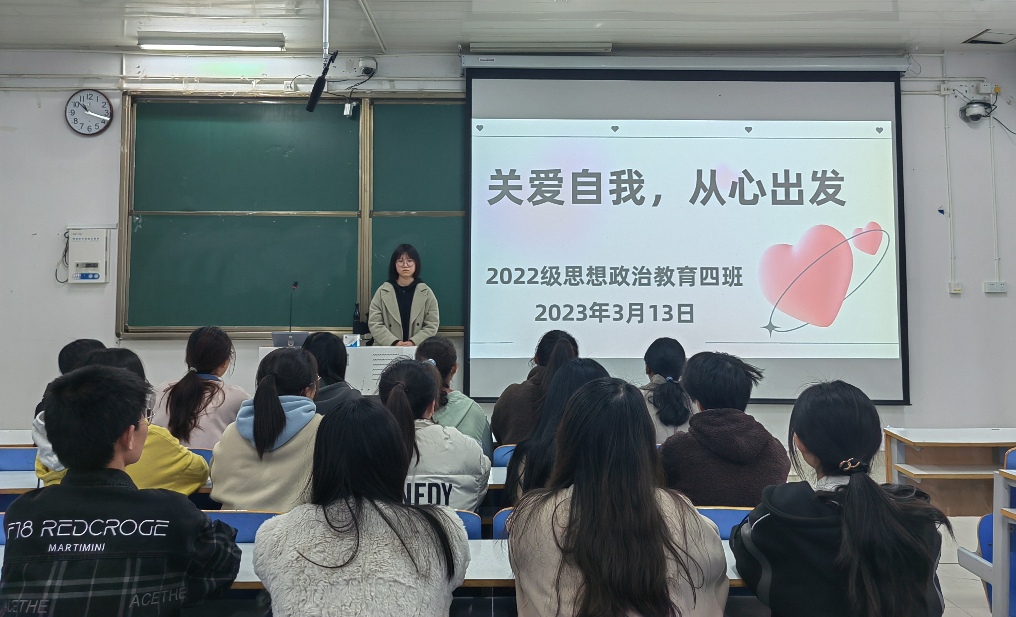 为加强员工心理健康教育,促进其身心和谐发展,3月13日下午,2026年世界杯官网2022级思想政治教育四班在社科楼514教室召开“关爱自我,从心出发”主题班会,2022级思想政治教育四班全体同学参加本次班会。班会由心理委员徐成若主持。