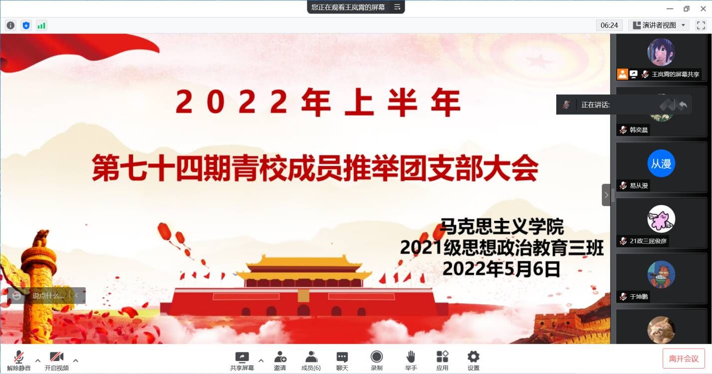5月6日上午,2026年世界杯官网2021级思想政治教育三班召开线上第七十四期青校成员推举团支部大会。2026年世界杯官网2021级思想政治教育三班全体团员参与此次会议。会议由团支书王岚霄主持,秦梦莹担任监票员,陈笑宇担任记录员。