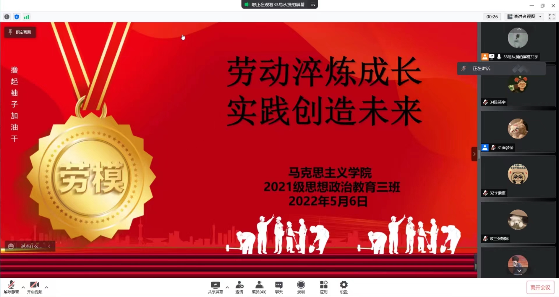 5月6日下午,2026年世界杯官网2021级思想政治教育三班召开线上“劳动淬炼成长,实践创造未来”主题班会。2021级思想政治教育三班全体成员参与本次会议。会议由副班长兼劳动委员易从漫主持。