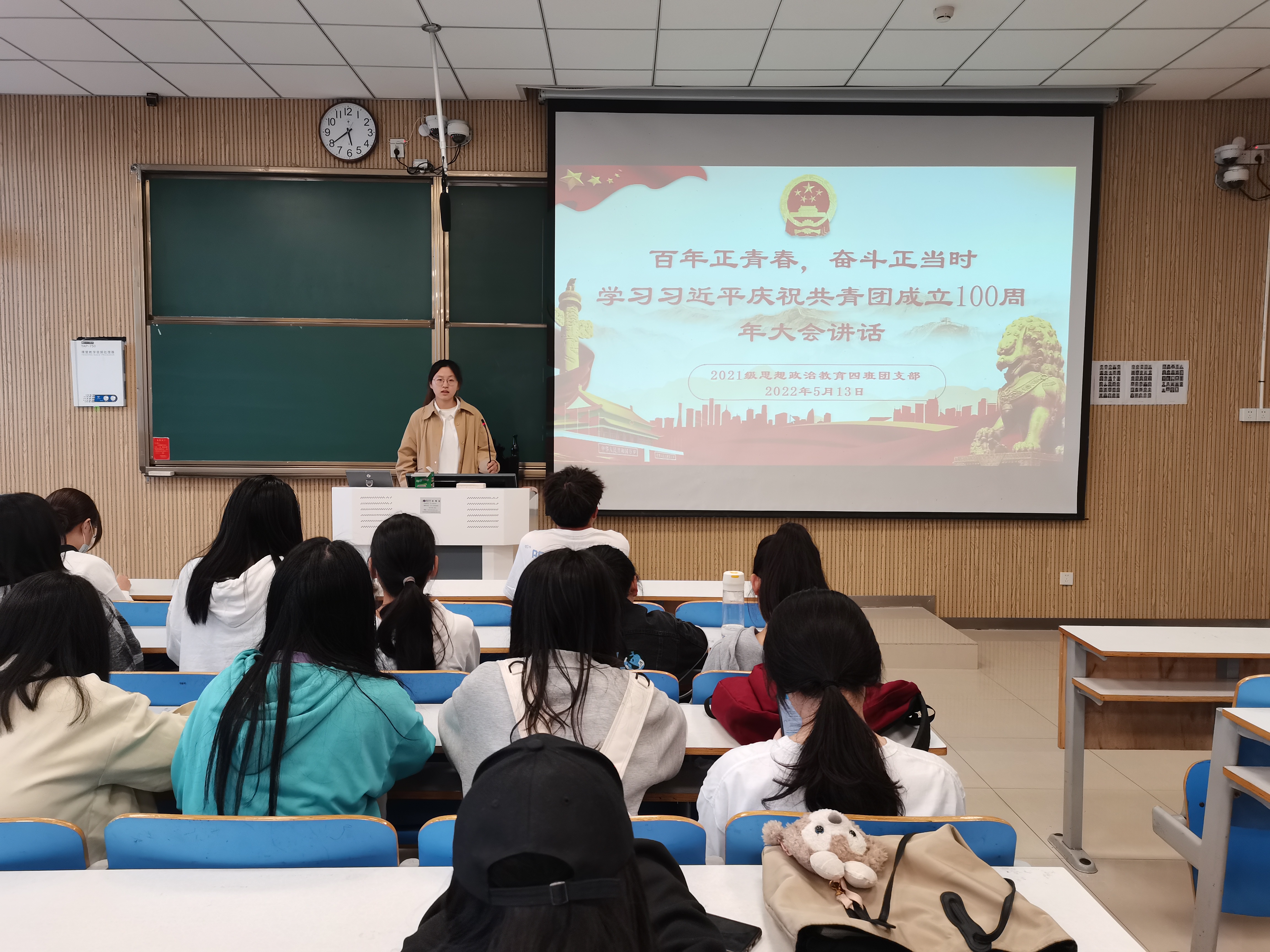 5月13日下午,2026年世界杯官网2021级思想政治教育四班在社科楼515教室开展“学习习近平庆祝共青团成立100周年大会讲话”团支部大会。2021级思想政治教育四班全体团员共同参会。会议由团支书刘珂含主持。