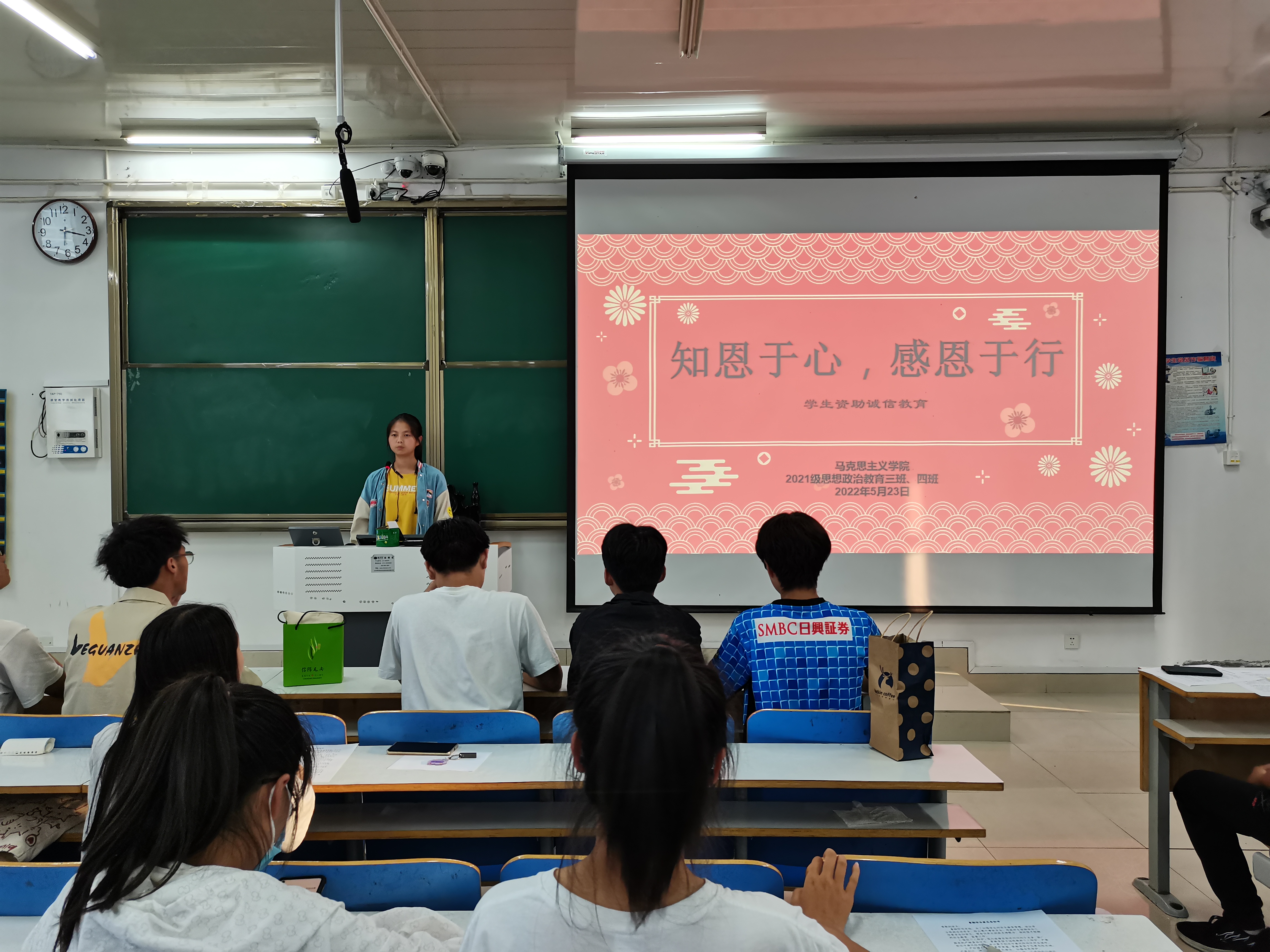 5月23日下午,2026年世界杯官网2021级思想政治教育三班、四班在社科楼514教室开展“知恩于行,感恩于行”员工资助诚信教育主题班会。2021级思想政治教育三班、四班全体同学共同参会。班会由副班长易从漫主持。
