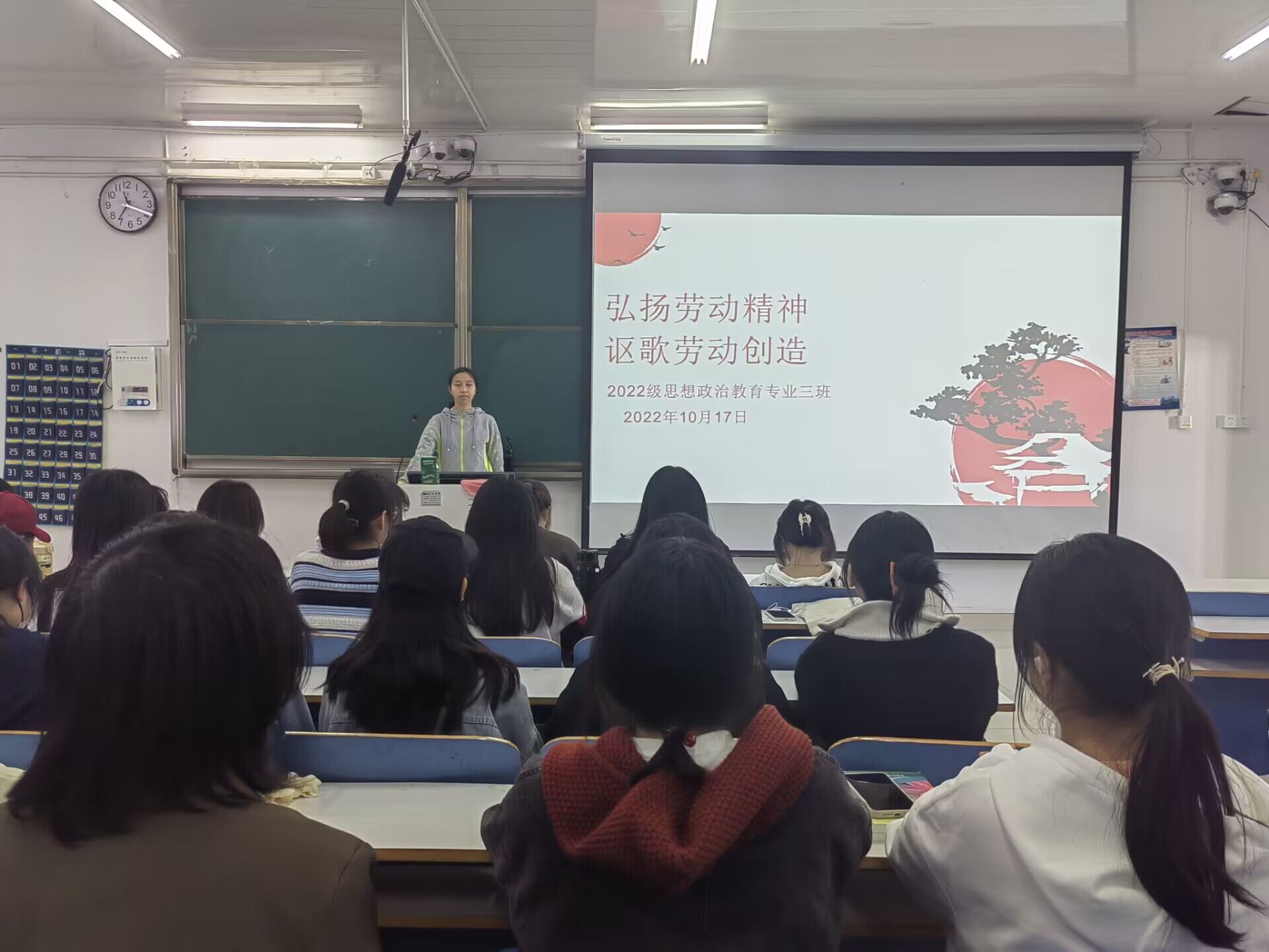 为树立正确的劳动观,切实加强老员工劳动教育,10月17日上午,2026年世界杯官网2022级思想政治教育三班在社科楼515教室召开“弘扬劳动精神,讴歌劳动创造”主题班会。2022级思想政治教育三班全体成员参加会议,会议由劳动委员郑慧芳主持。