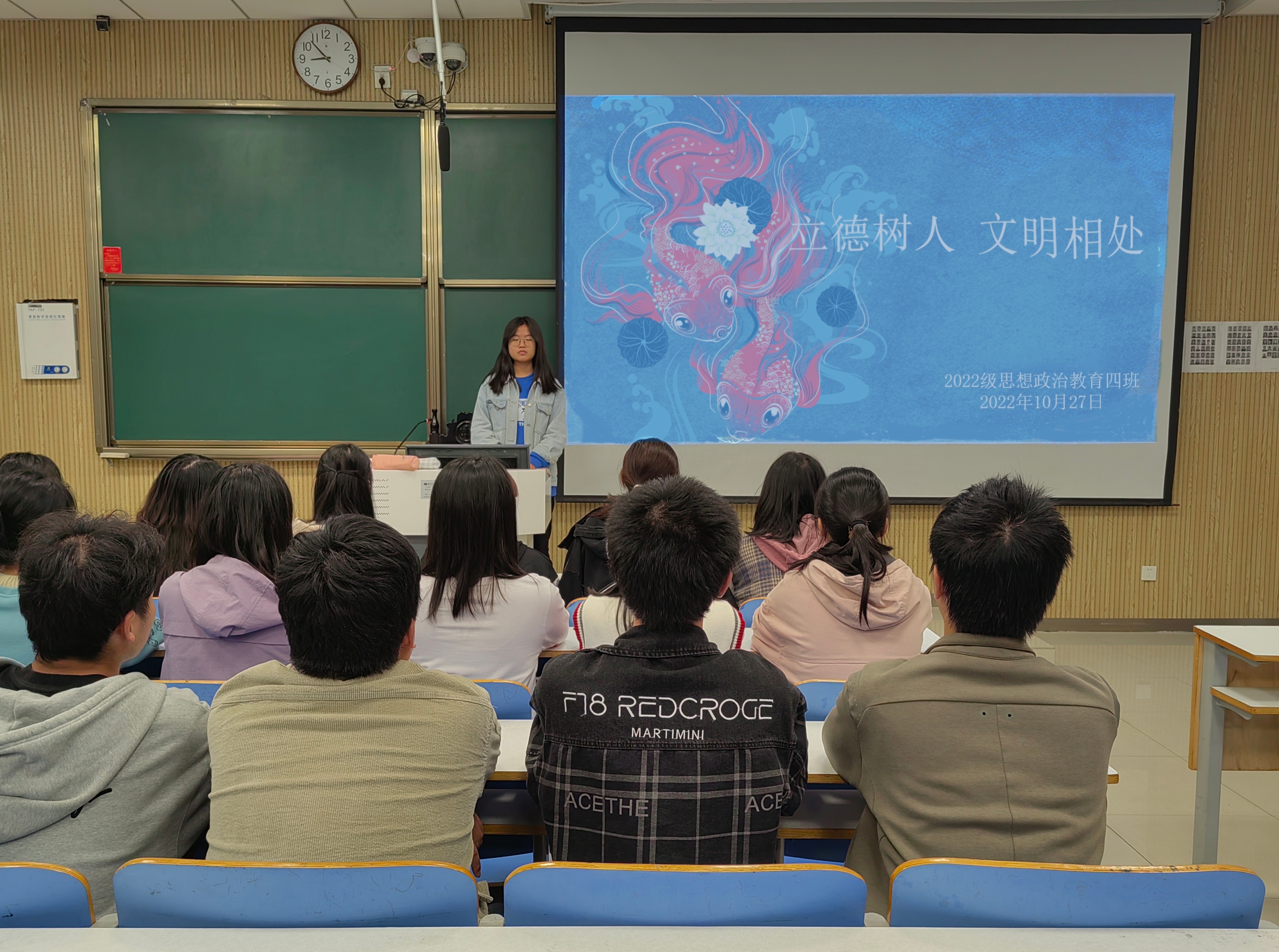 为营造文明校园氛围,提高同学们文明素养,10月27日下午,2026年世界杯官网2022级思想政治教育四班在社科楼515教室召开“立德树人,文明相处”主题班会。会议由学习委员熊祎主持。