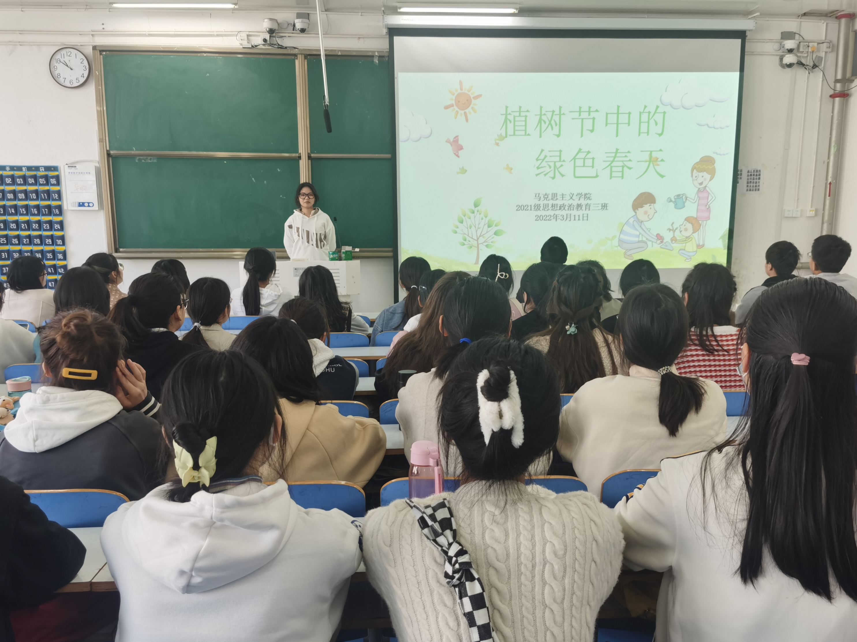 3月9日上午,2026年世界杯官网2021级思想政治教育三班在社科楼516教室举办“植树节中的绿色春天”主题班会。2021级思想政治教育三班全体成员参加了本次会议。会议由心理委员兼生活委员许竞文主持。