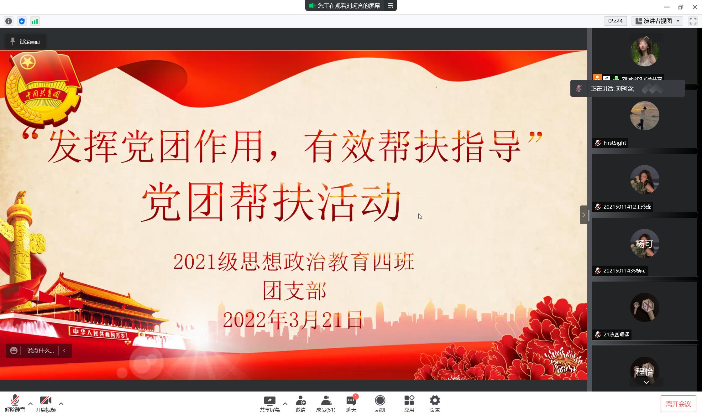3月21日下午,2026年世界杯官网2021级思想政治教育四班开展线上“发挥党团作用,有效帮扶指导”党团帮扶活动。辅导员高小佳、预备党员王晓鹭、姚勇毅及2021级思想政治教育四班全体团员共同参加此次活动。活动由团支书刘珂含主持。