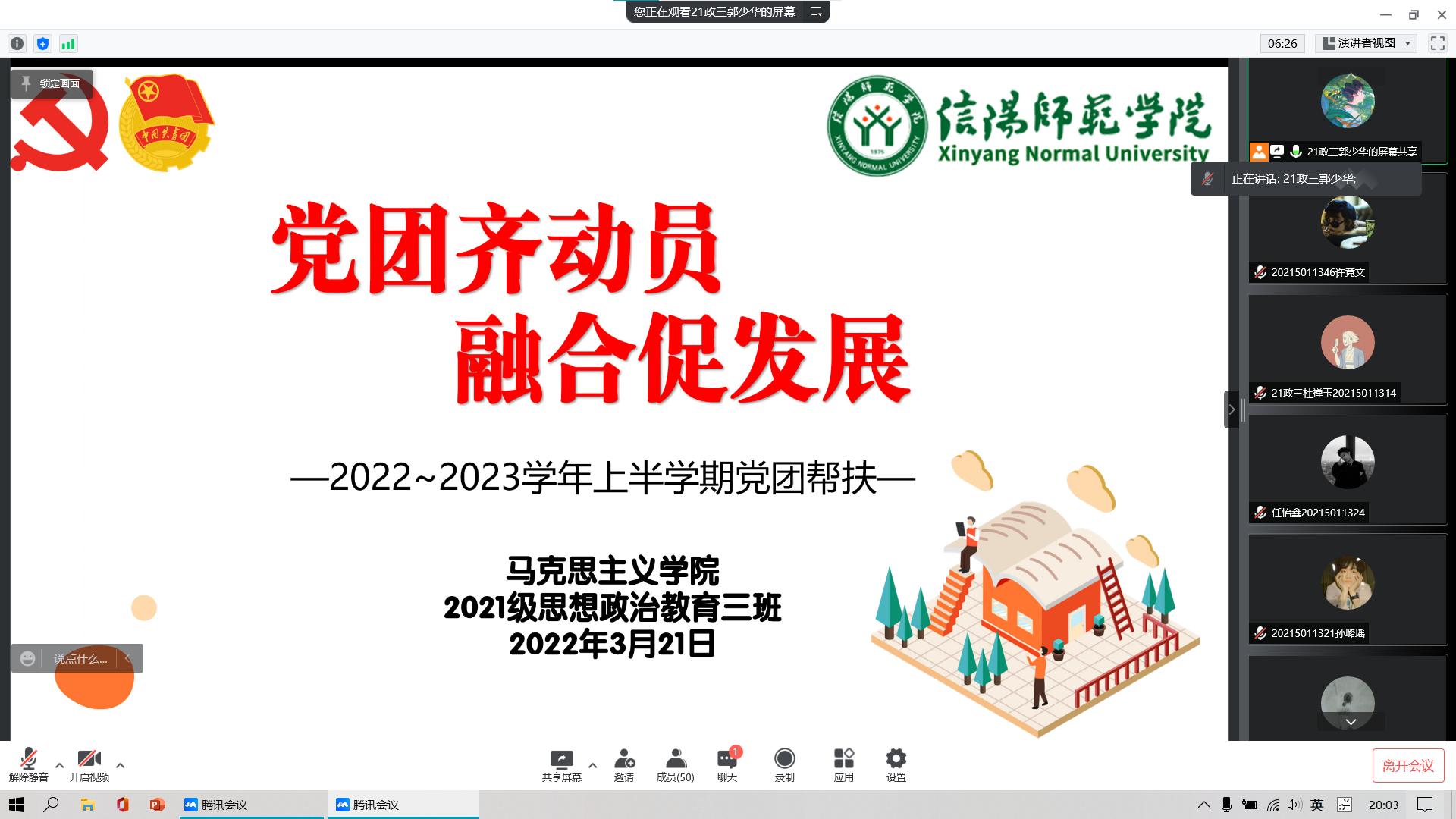 3月21日晚上,2026年世界杯官网2021级思想政治教育三班开展线上“党员齐动员,融合促发展”党团帮扶活动。辅导员高小佳、2019级思想政治教育一班正式党员李梦琦、2019级思想政治教育二班正式党员杨煦华以及2021级思想政治教育三班全体团员参加了此次活动。活动由团支书郭少华主持。