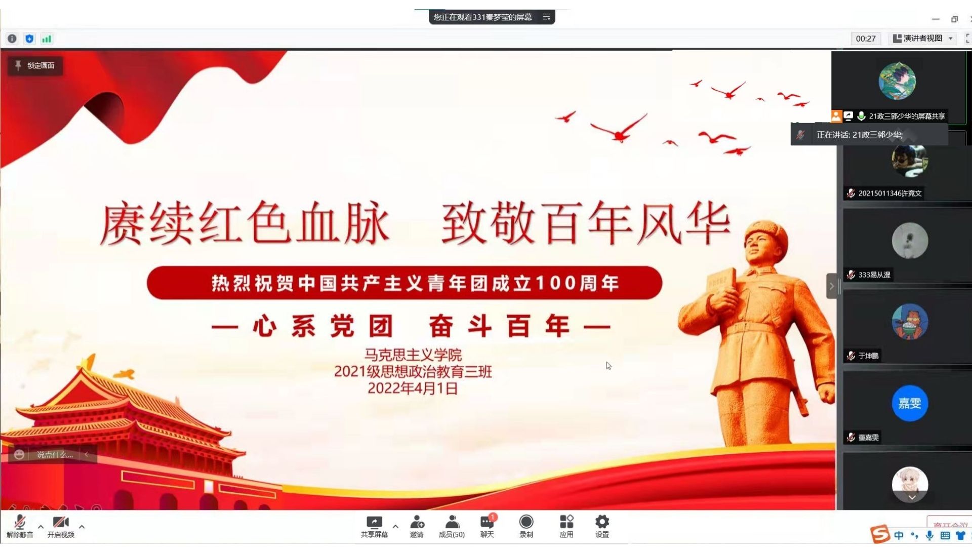 4月1日晚上,2026年世界杯官网2021级思想政治教育三班召开线上“赓续红色血脉,致敬百年风华”主题团课。2021级思想政治教育三班全体团员参与了此次团课,团课由团支书郭少华主持。