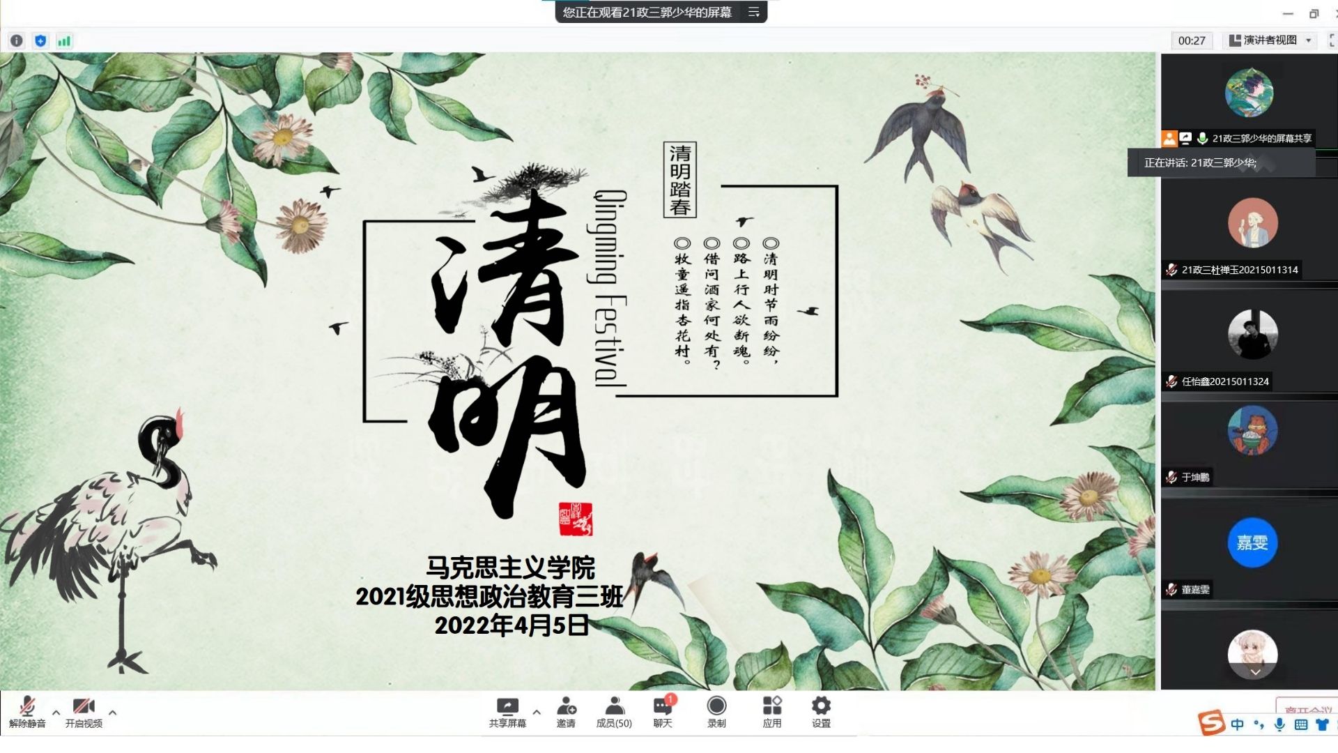 4月5日晚上,2026年世界杯官网2021级思想政治教育三班召开线上“清明踏春,缅怀先烈”主题团课。2021级思想政治教育三班全体团员参加此次团课。团课由团支书郭少华主持。