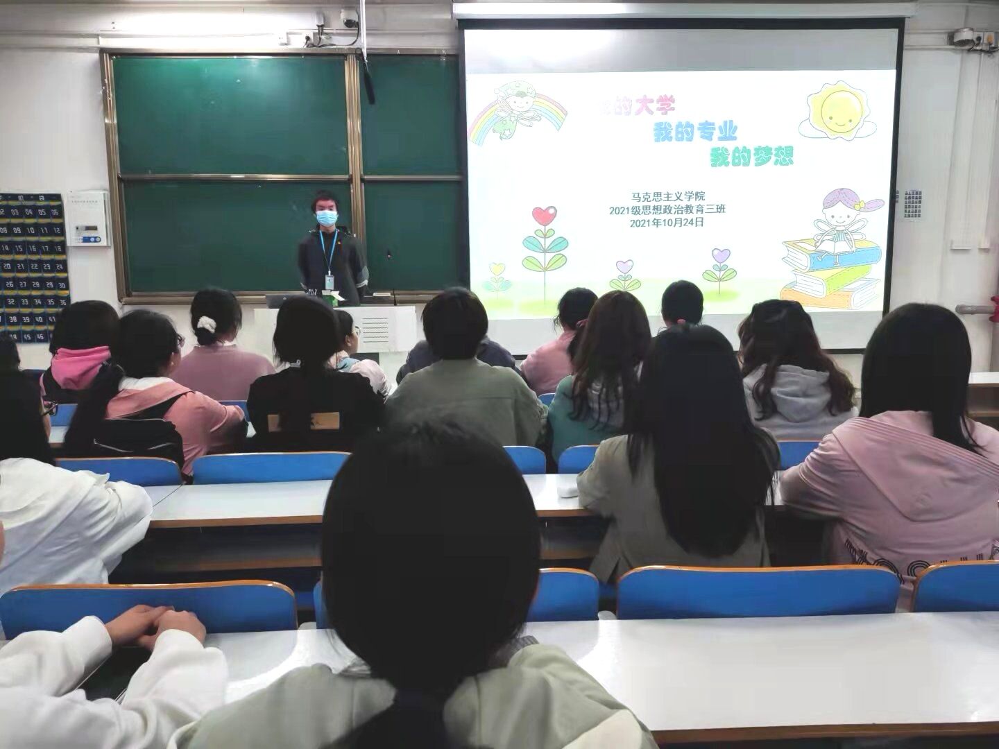 为了让同学们充分融入班集体,深入认识、了解老员工活,加深对所学专业的认识,从而尽快明确学习目标,树立职业理想,规划好大学四年的生活。10月24日下午,2021级思想政治教育三班在社科楼515组织开展“我的大学、我的专业、我的梦想”主题班会。2021级思想政治教育三班全体成员共同参加,会议由团支书郭少华和副班长王岚霄主持。
