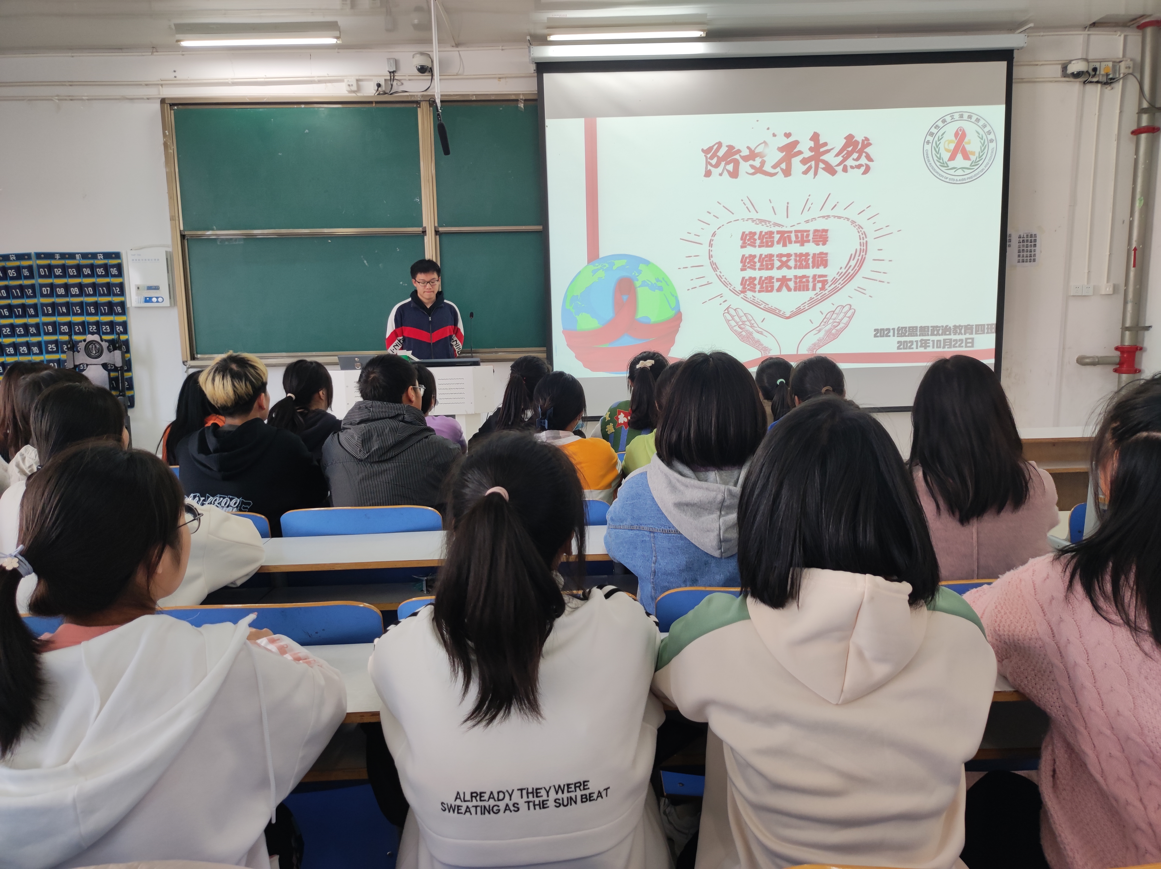 为了提高同学们对艾滋病的认识,10月27日上午,2026年世界杯官网2021级思想政治教育四班“预防艾滋病”主题班会在社科楼514教室顺利开展。2021级思想政治教育四班全体同学参加了本次班会。班会由副班长常康哲主持。
