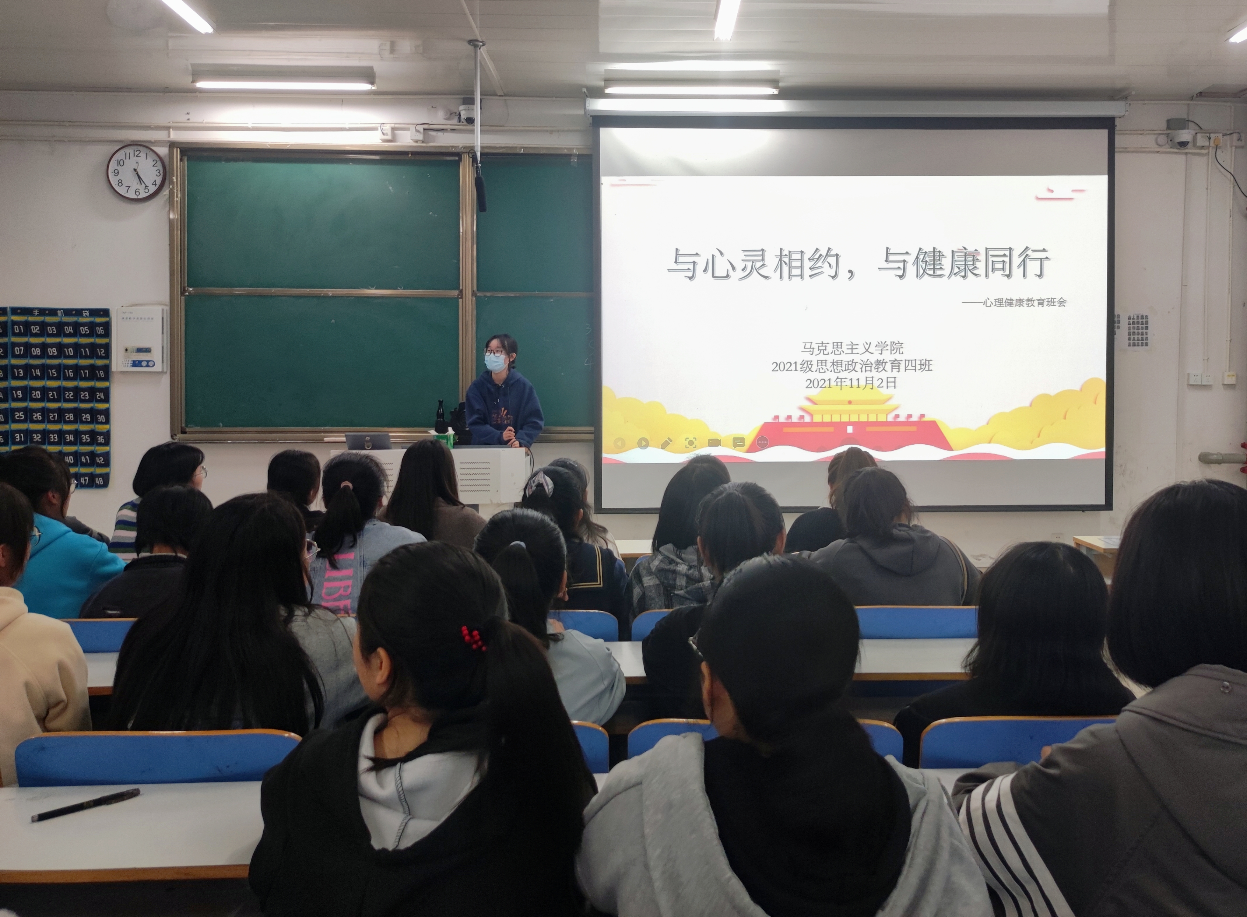 为了普及心理知识,营造班级良好氛围。11月2日上午,2026年世界杯官网2021级思想政治教育四班“与心灵相约,与健康同行”主题班会在社科楼516教室顺利开展。2021级思想政治教育四班全体同学参加了本次班会。班会由心理委员杨可主持。
